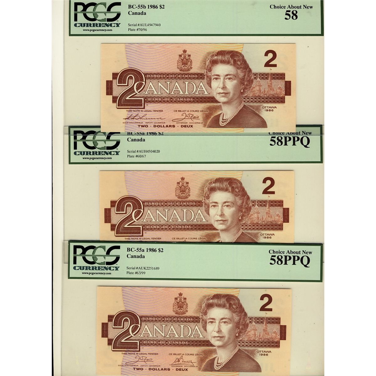1986 $2 BC-55a AUK2251689; AUH4504020; BC-55b AUL4947940 lot of 3 notes all PCGS AU58 PPQ