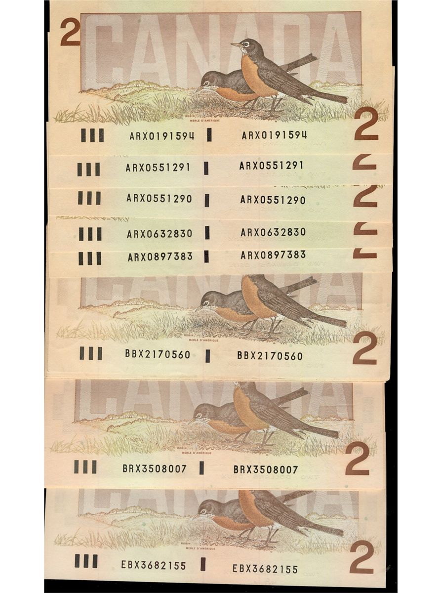1986 $2 BC-55aA #ARX(5) (below 1,26), BC-55bA #BBX Sml B(10), Lg B6), #BRX(10), EBX(2) & BC-55cA. Lot of 34 replacement notes VG to UNC.