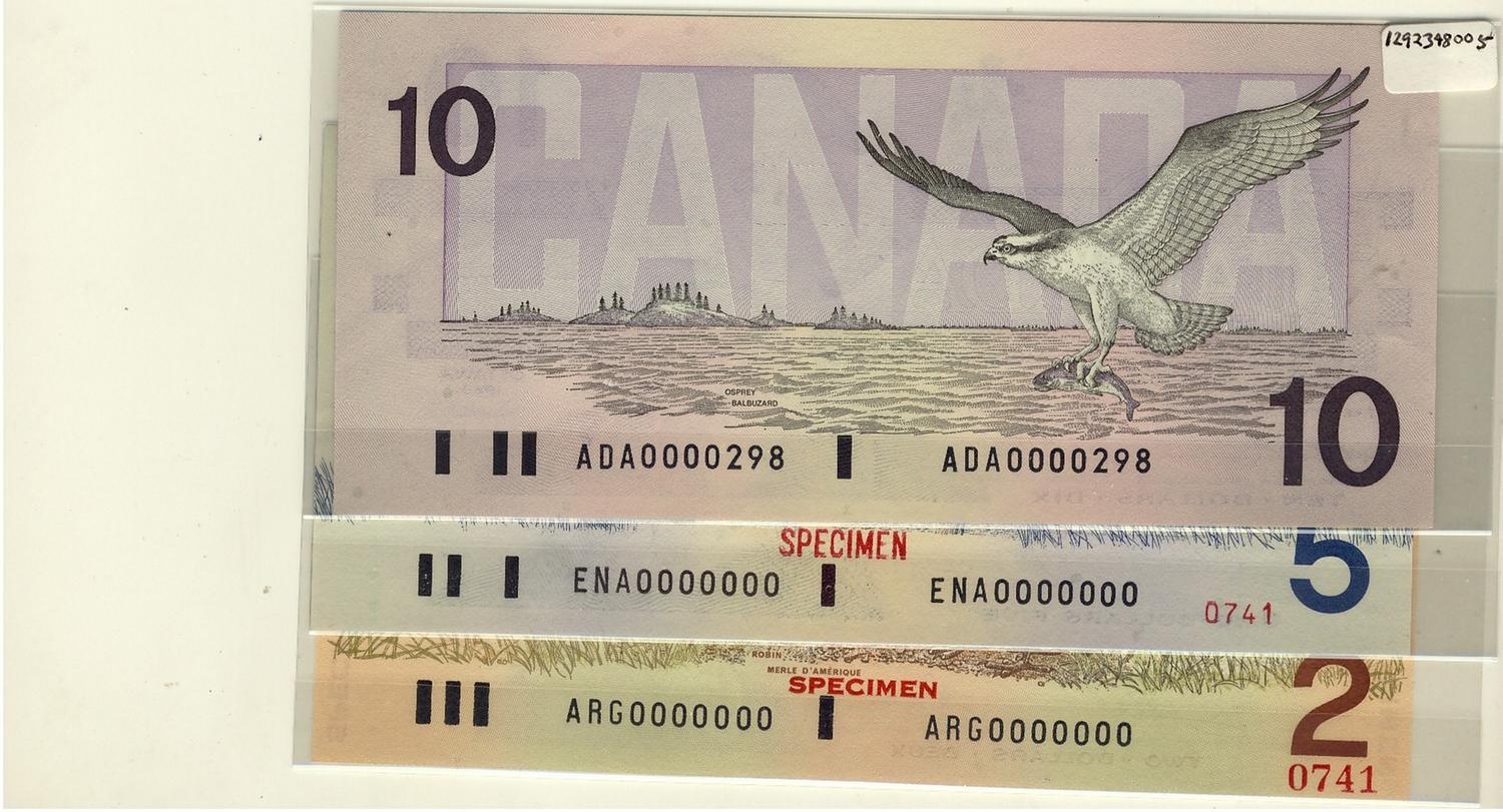 1986 $2 BC-55aS & $5 BC-56aS SPECIMEN (#0741) issues and 1989 $10 BC-57a Low serial number #ADA0000298. Lt f 3 notes all UNC.