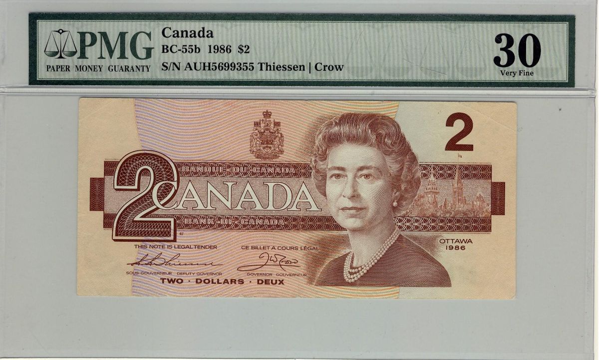 1986 $2 BC-55b AUH5699355 PMG VF30. Only four examples known. An ultra rare Canadian banknote.
