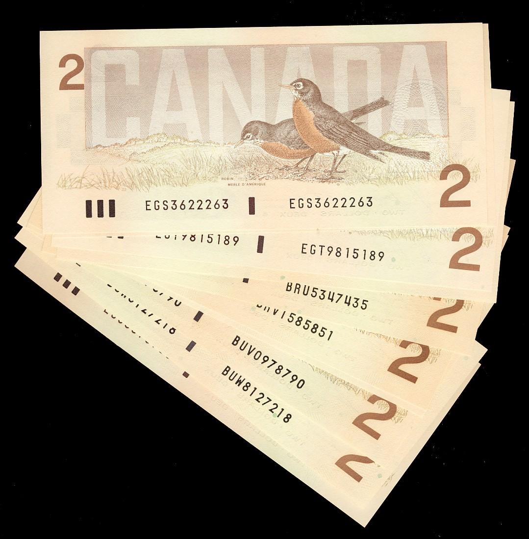 1986 $2 BC-55b & BC-55c RADAR notes. Lot of 10 notes. #EGS3622263, EGT2739372, EGT9815189, 8296928, BRU5347435, BRV1585851, BUT0046400, BUV0978790, BUW8127218 AND EGJ6396936. Crisp UNC.