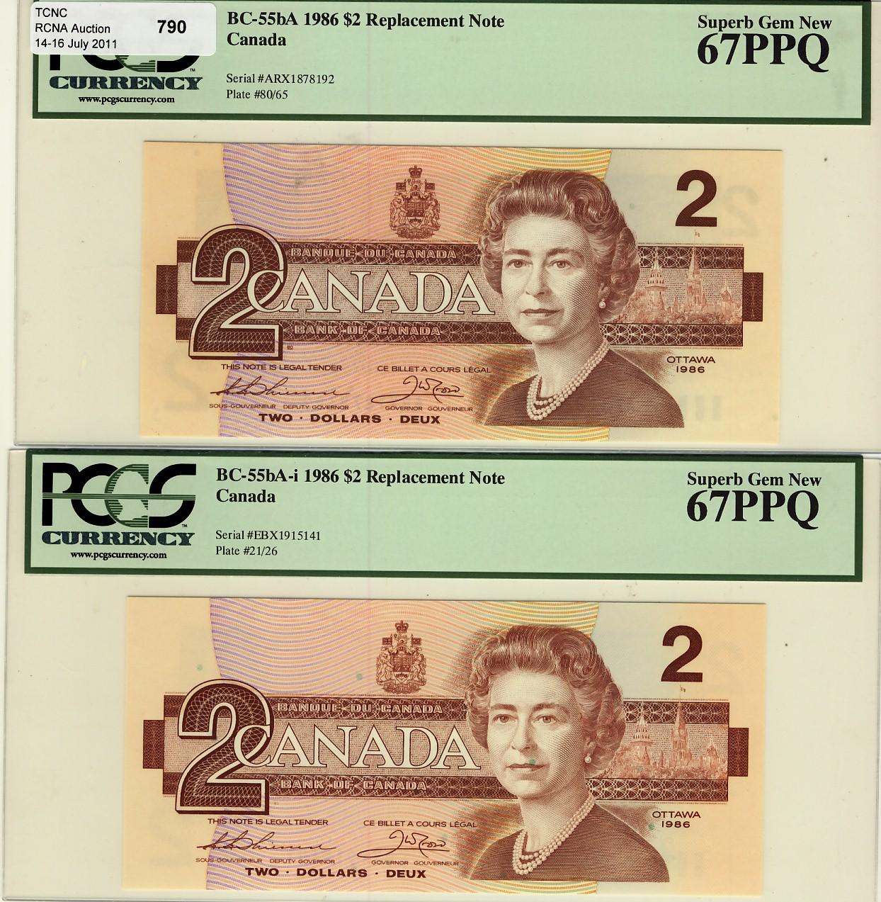 1986 $2 BC-55bA ARX, $2 BC-55bA-i EBX both PCGS UNC67PPQ