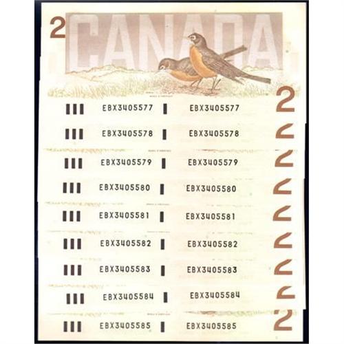 1986 Two Dollars Thiessen-Crow Replacement Notes, BC-55bA-i Nine Consecutive Serial Numbers EBX3405577 to EBX3405585, Uncirculated