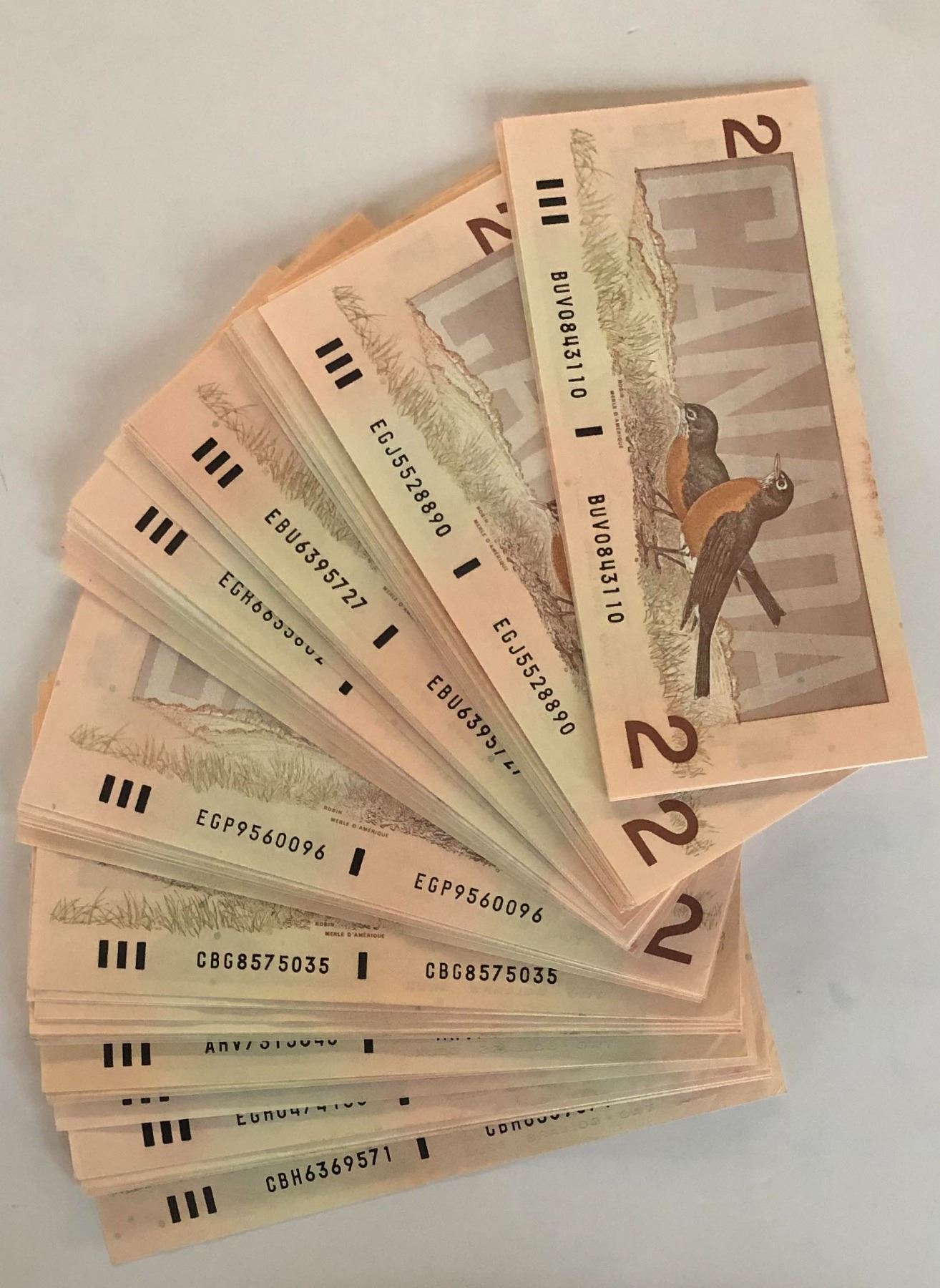 1986 $2 Lot of 95 notes EF to Gem Unc. Various signatures & prefixes. Includes a few consecutive runs as well.