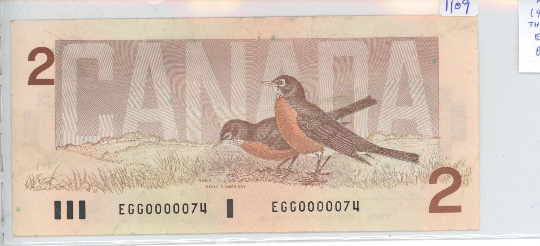 1986 $2 Low Serial Number. Thiessen-Crow signatures. EGG Prefix. Low Serial Number 0000074. BC-55b-i. F-15.