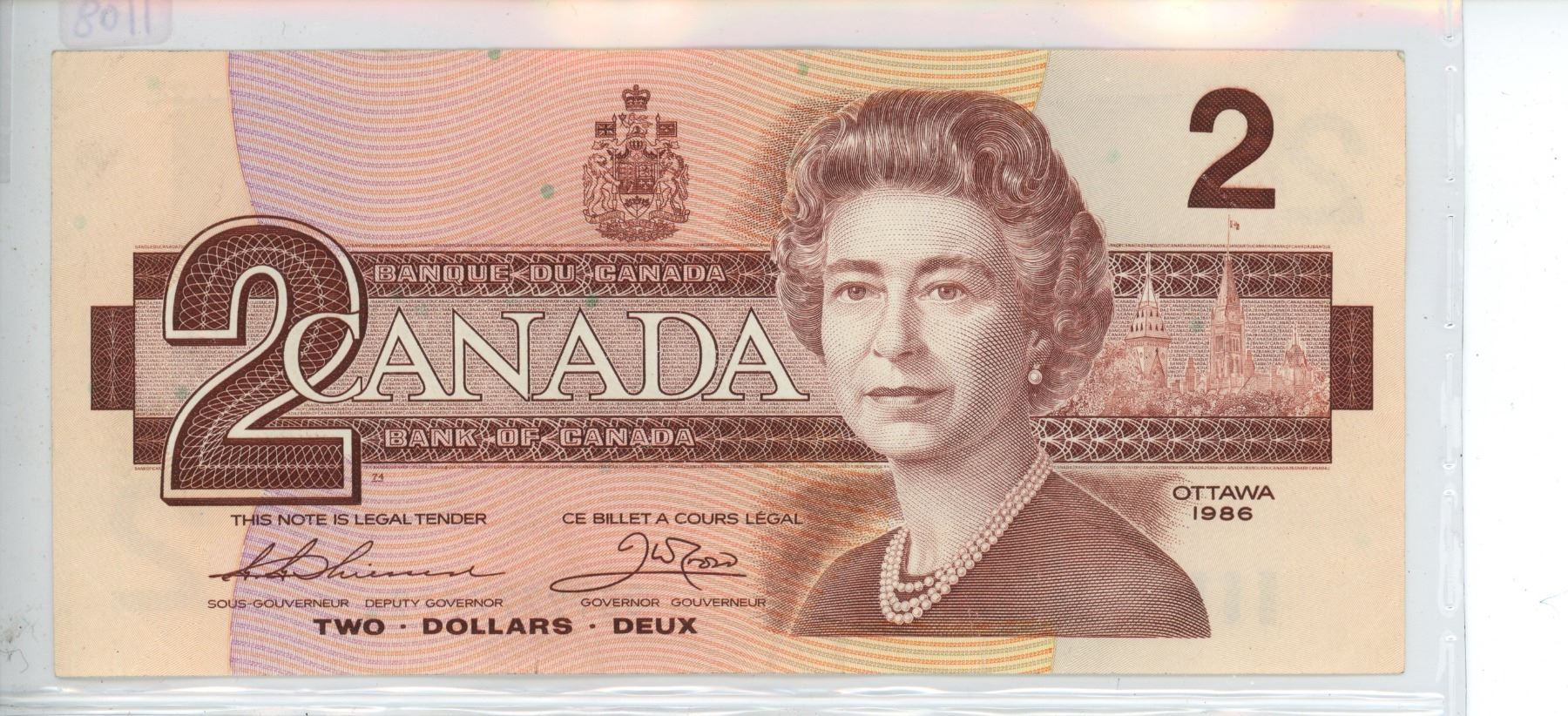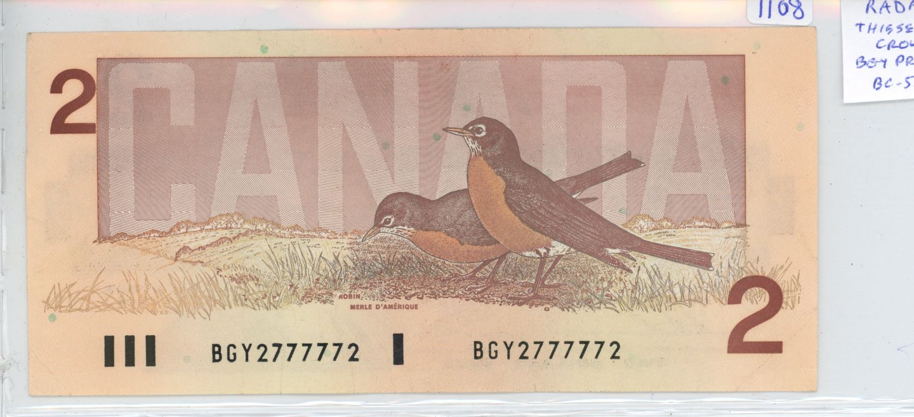 1986 $2 RADAR. Thiessen -Crow signatures. BGY Prefix. 2-Digit RADAR Serial Number 2777772. BC-55b. VF-20.