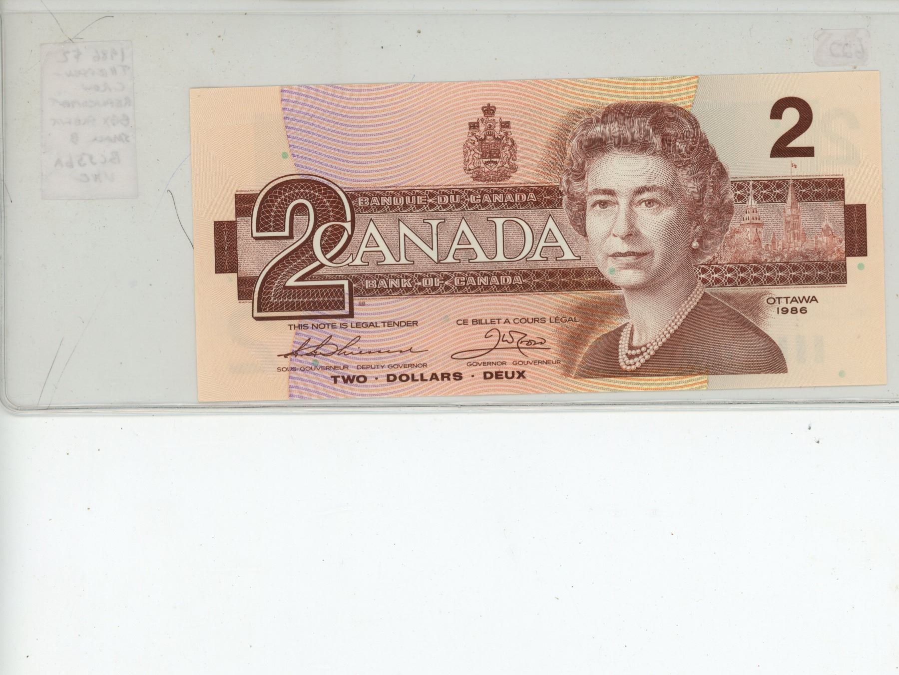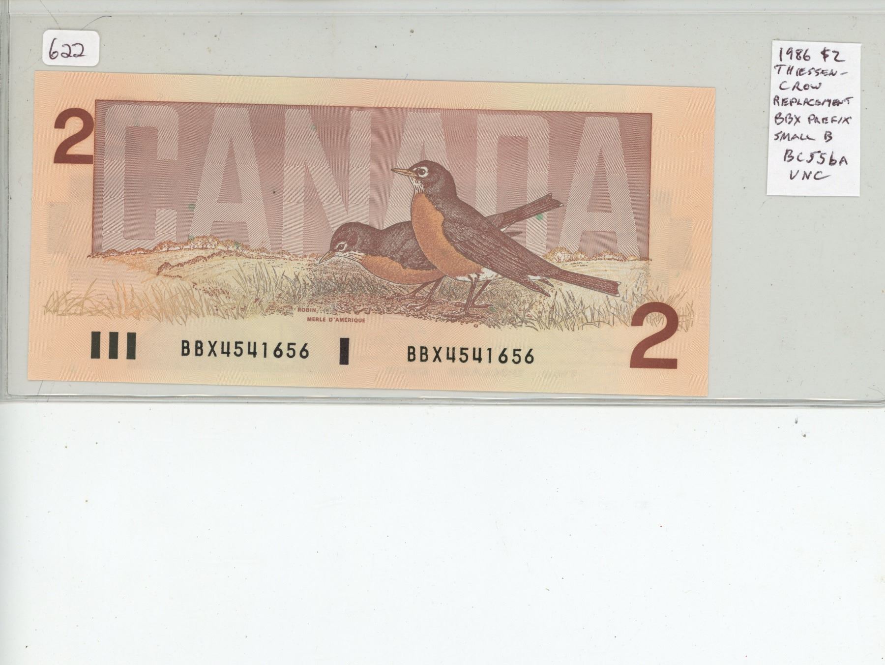 1986 $2 Replacement. Thiessen-Crow signatures. BBX Replacement Prefix. Small B. BC-55bA. Uncirculated.