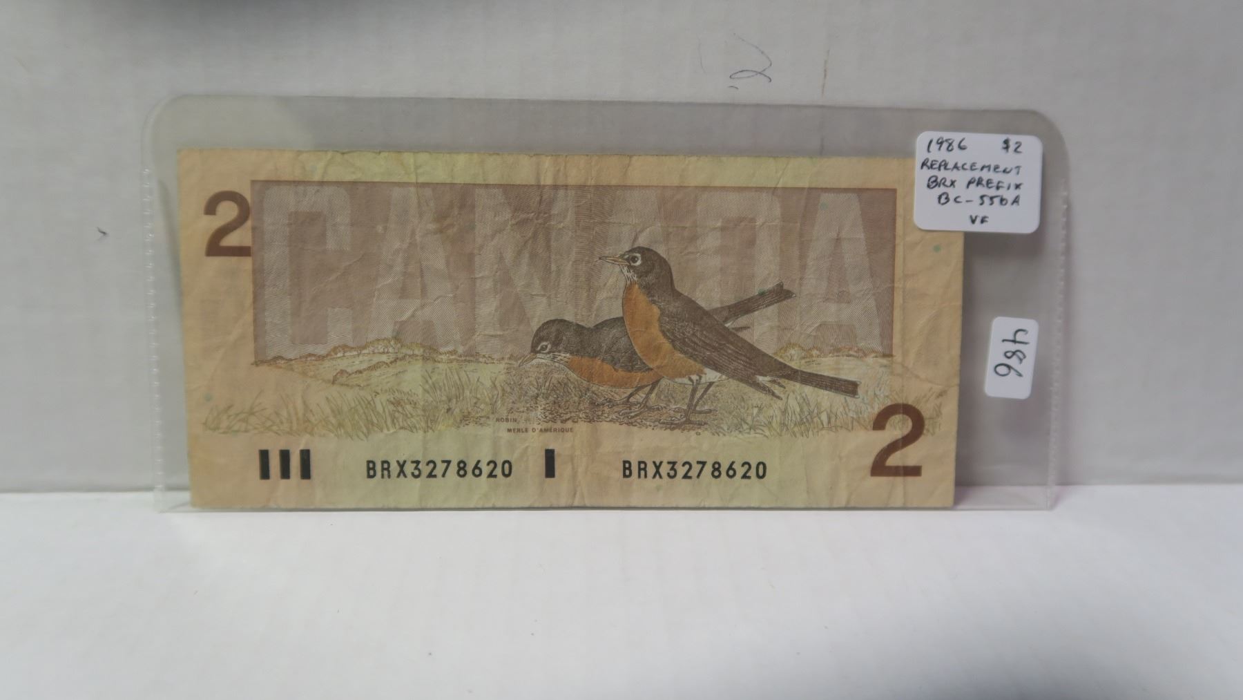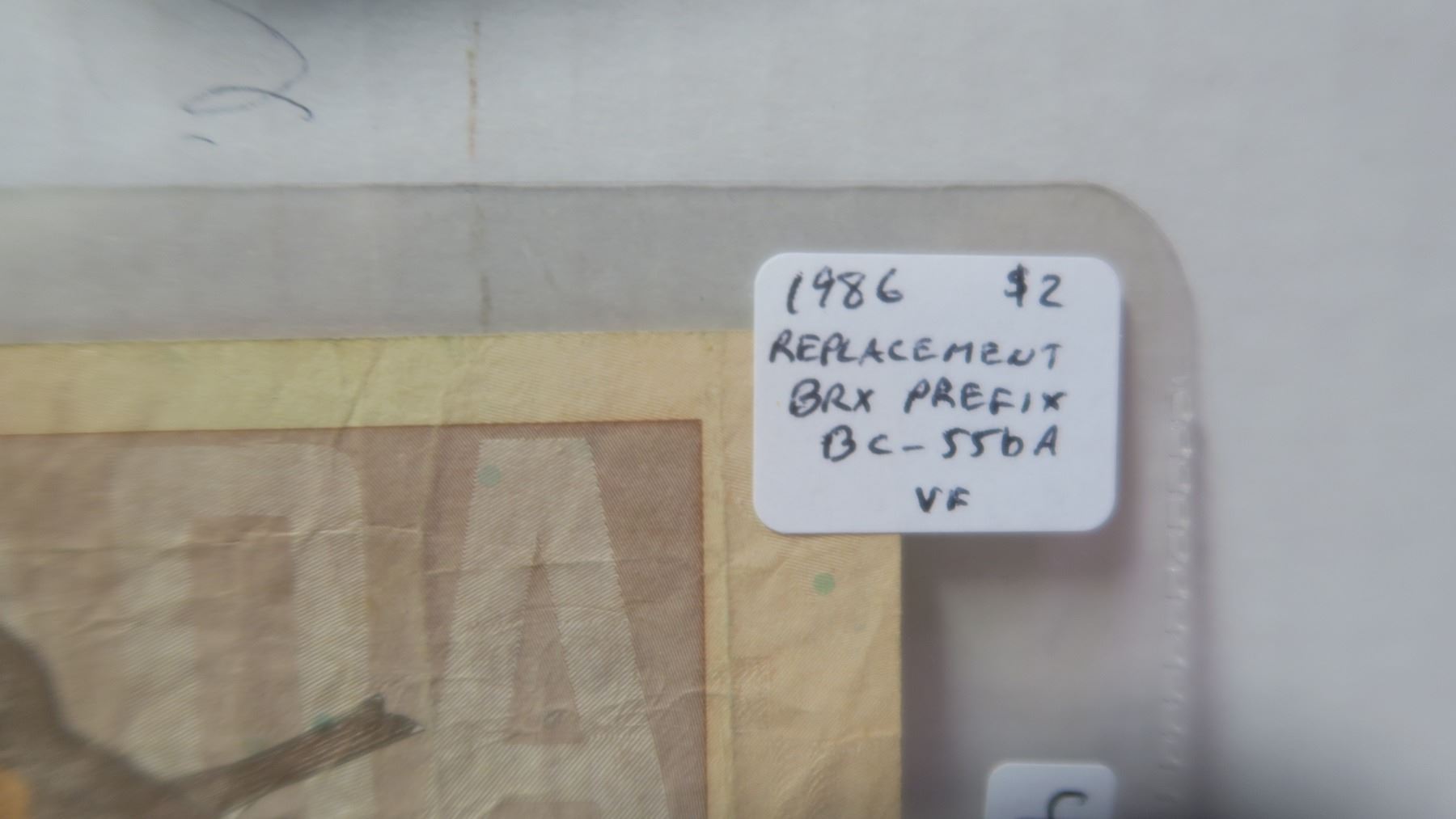 1986 $2 Replacement. Thiessen-Crow signatures. BRX Replacement Prefix. BC-55bA. VF.