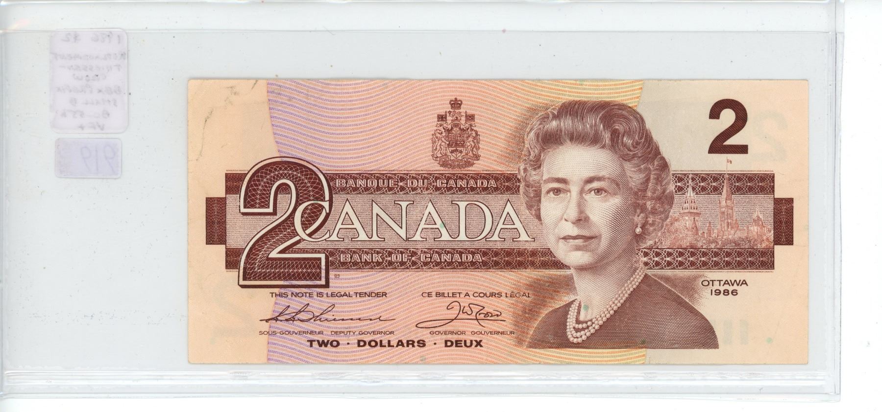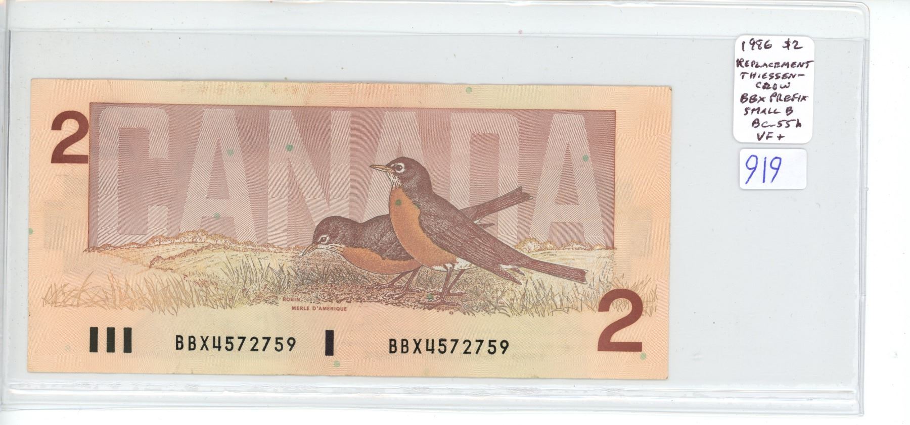 1986 $2 Replacement note. Thiessen-Crow signatures. BBX Replacement Prefix. Small B. BC-55b. VF-30.