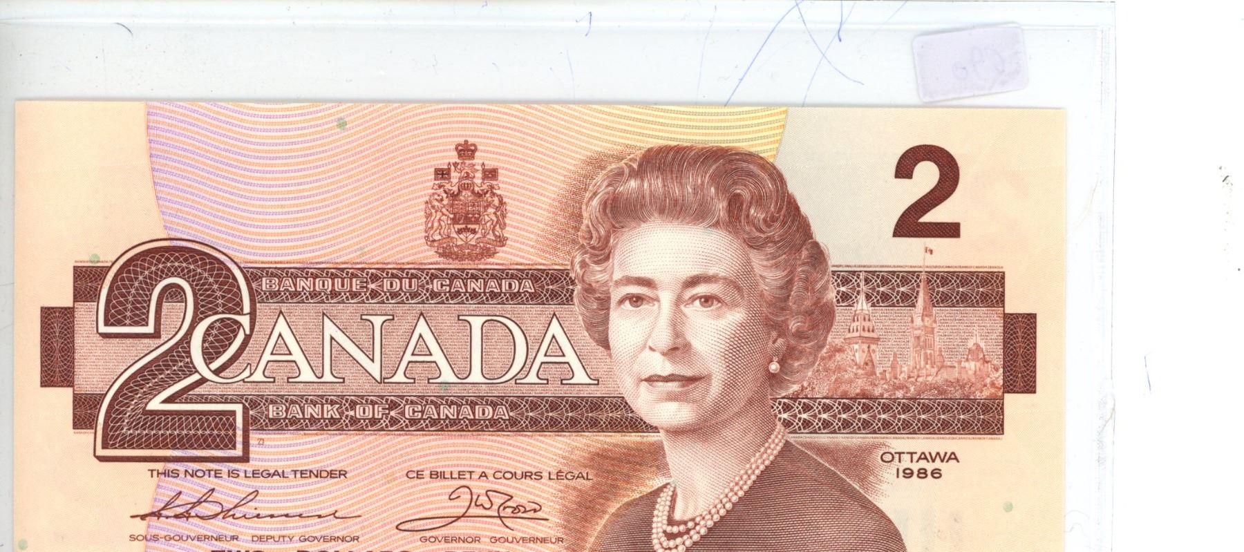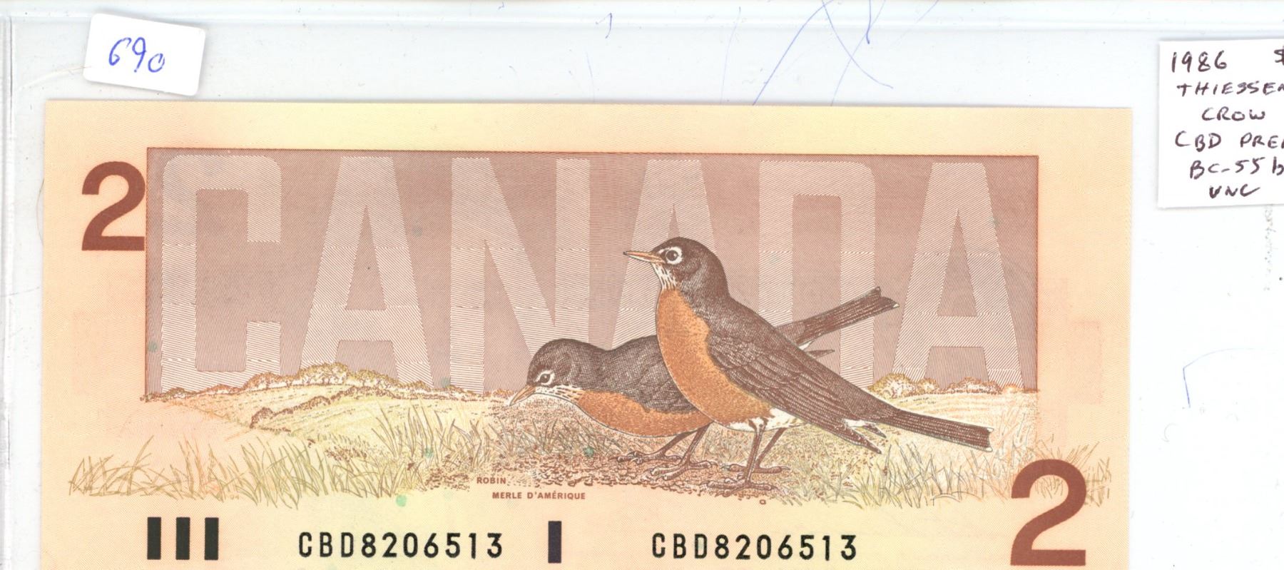 1986 $2. Thiessen-Cross signatures. CBD Prefix. BC-55b. Uncirculated.
