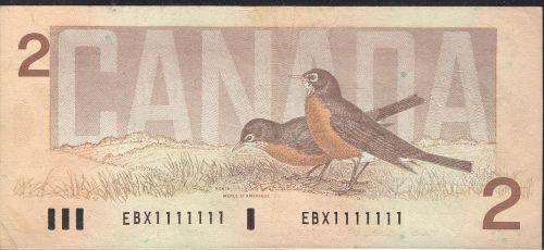 1986 $2 Thiessen-Crow RARE SOLID REPLACEMENT note. EBX1111111. VF with a light pink pen mark on the reverse but not distracting. Only a few notes can possibly exist. First example seen by the cataloguer. Worth a premium bid!