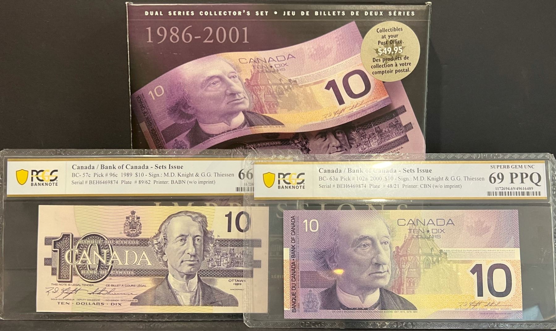 1986-2001 $10 Lasting Impression Set. Both 2 notes PCGS grade Gem UNC66PPQ.