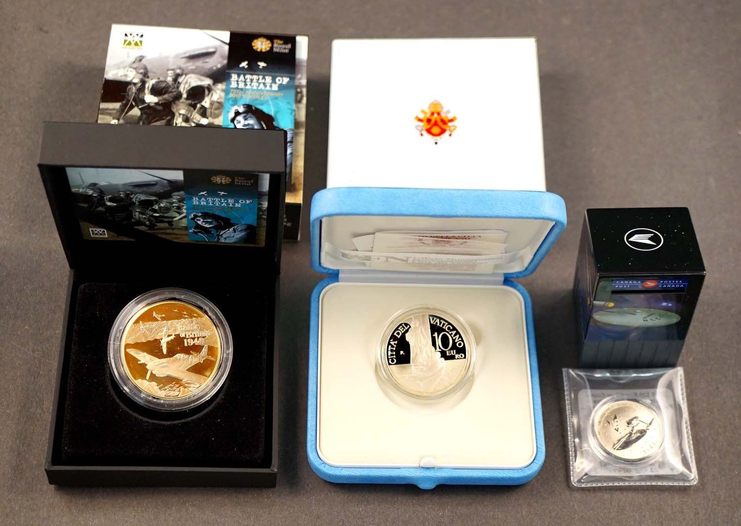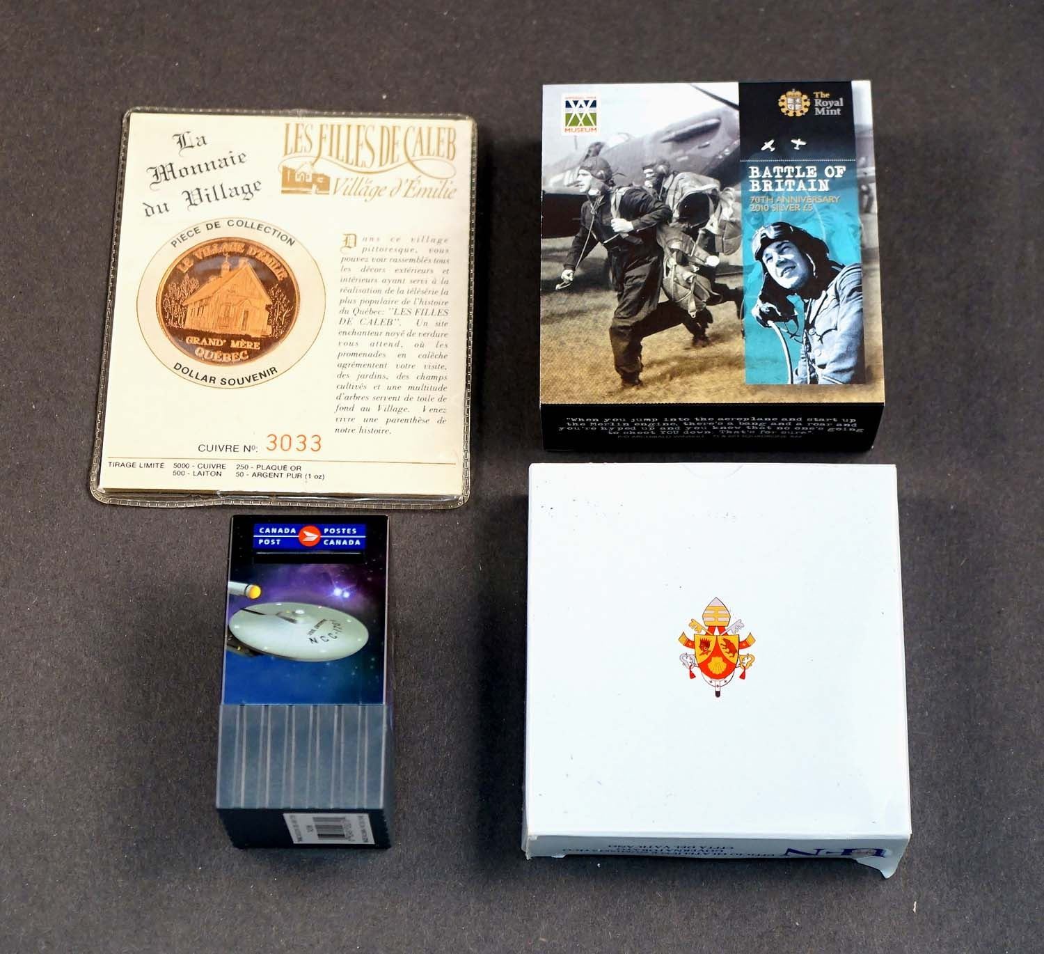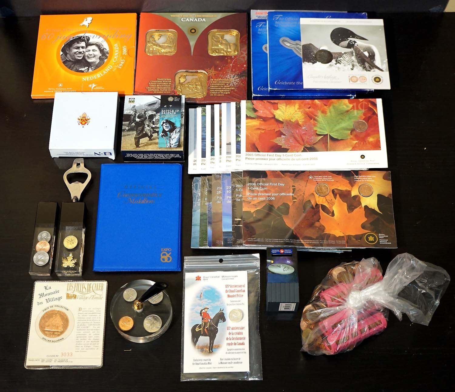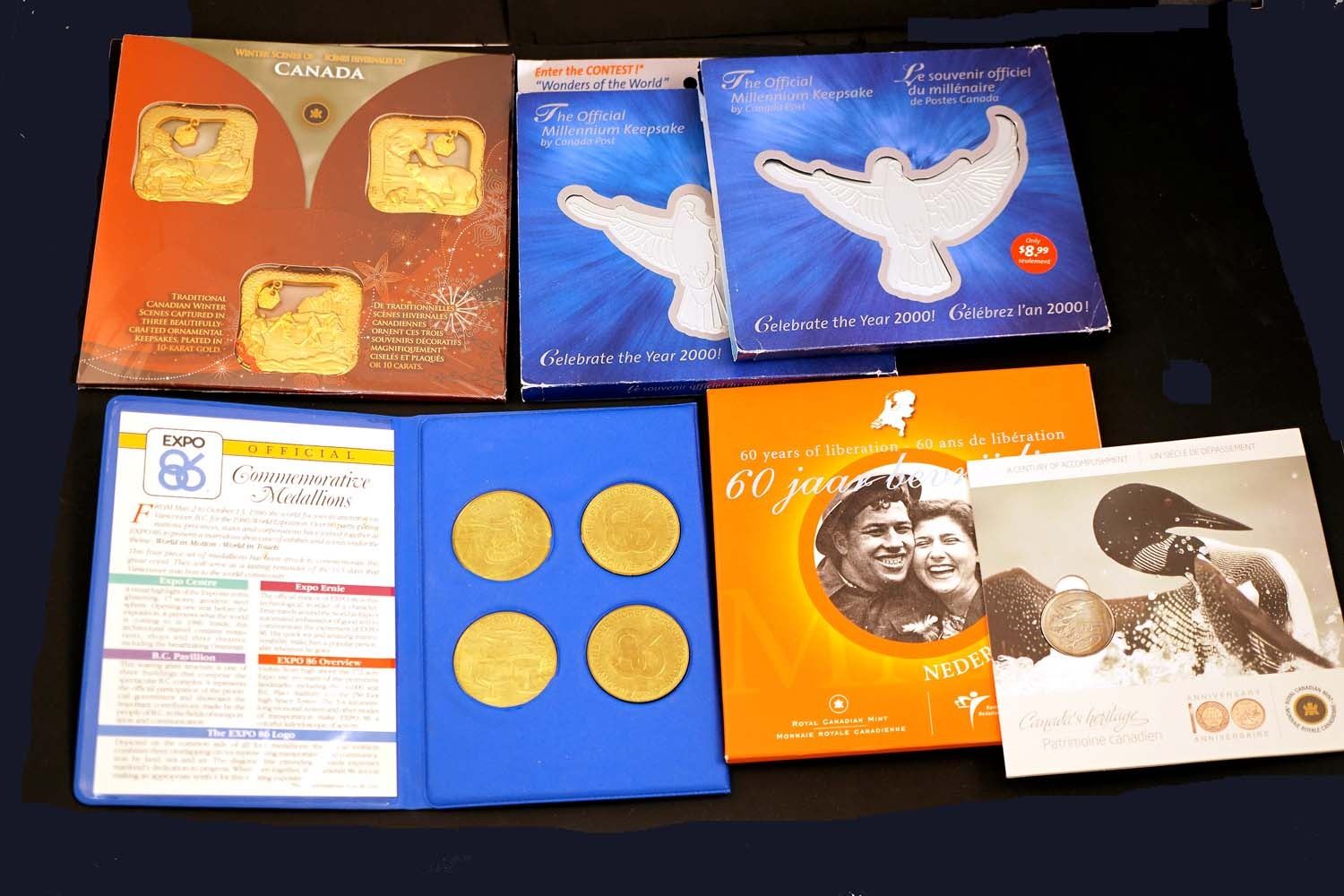 3 x Lucite items, 302 Foreign coins, 2 Complete Sets of Official First Day Mintage 1 Cent to Twoonie 2005 and 2006, 1991 Ville de Grand Mere Trade dollar, a 4 medal set for Expo 86 Vancouver, 2 x 2000 Canada Post Millennium sets, 1 x 2008 Winter Scenes of Canada ornaments by Susan Taylor, 1 x 1998 RCMP Dollor lapel pin, 1 x 2010 Great Britain 5 Pounds Proof, 1 x 2012 Vatican City 10 Euro Proof w/COA, box and sleave, 1 x 2008 100thh. Anniversay RCM token, Canada Post Mail Box w/ Star Trek $20 for 20. and 2005 Euro Year Set 60th Anniversary of the Liberation of the Netherland w/ special Canadian 25 Cents and medal.