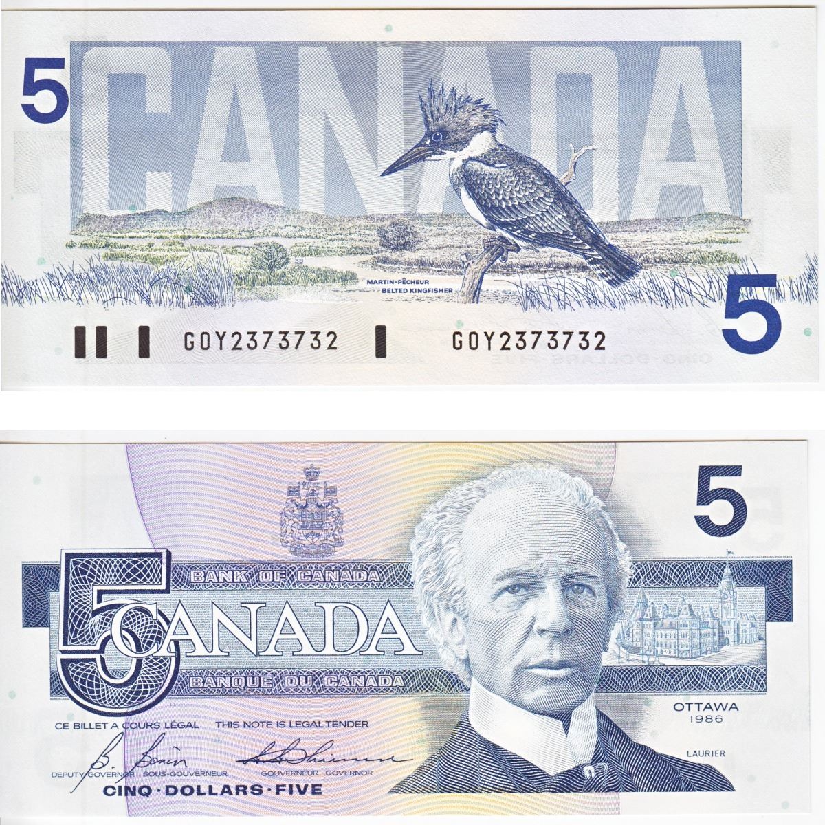1986 3 Digit RADAR $5.00 Note from the Bank of Canada; cat code BC-56c, Bonin-Thiessen signatures, P