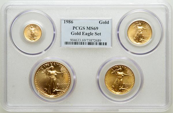 1986 4-piece Gold Eagle Mint Set. PCGS graded MS-69 All in one holder. Contains: 1/10th oz; ¼ oz; ½ oz; 1 oz.