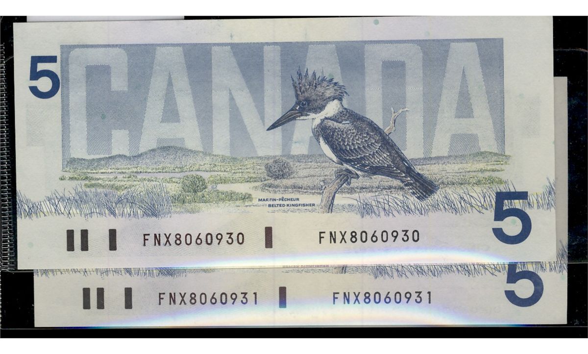 1986 $5 BC-55bA #FNX8060930/931. Lot of 2 consecutive issues. Prefix FNX with Small F's in Almost UNC Condition