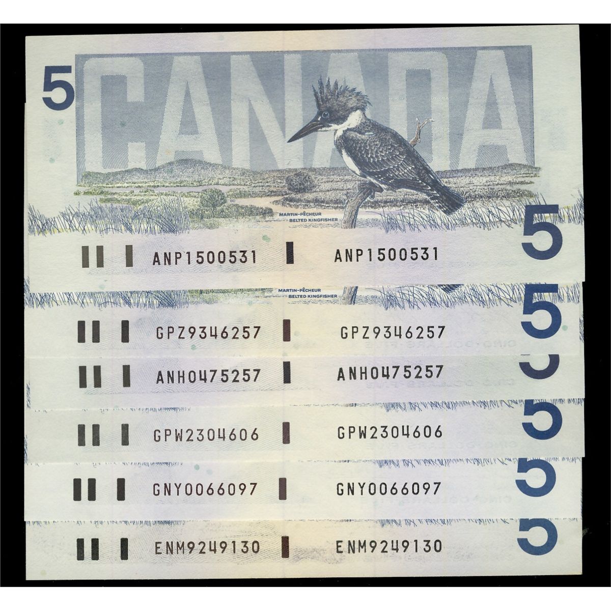 1986 $5 BC-56a #ENM, BC-56b #GNY, BC-56b #GPW, BC-56c-i #ANH, BC-56e #GPZ & BC-56e-I #ANP. A nice lot of 6 notes AU to UNC.