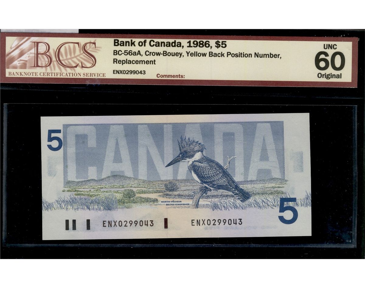 1986 $5 BC-56aA, #ENX with Yellow Back Position Number, BCS Certified UNC-60, Original.