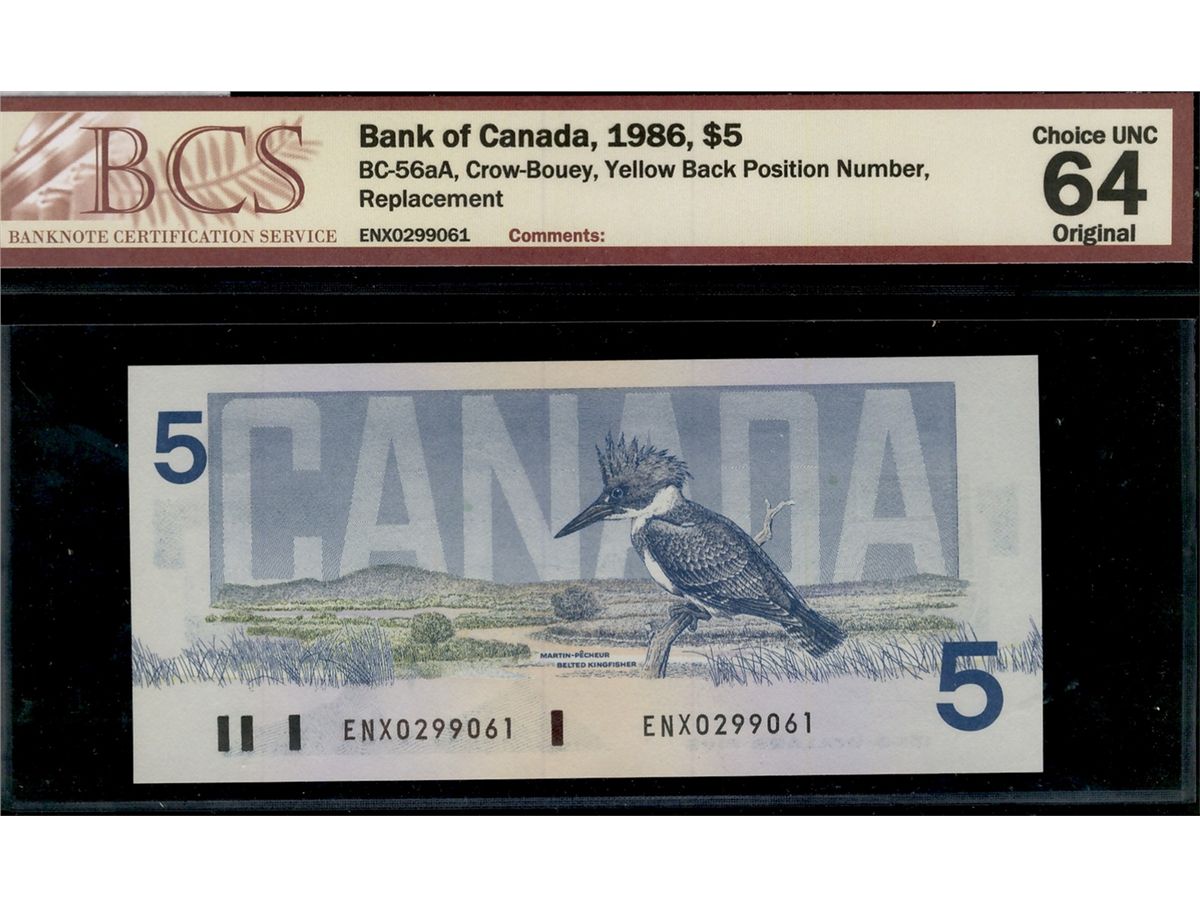 1986 $5 BC-56aA, #ENX0299061, Yellow Back Position Number, BCS Certified CUNC-64, Original.