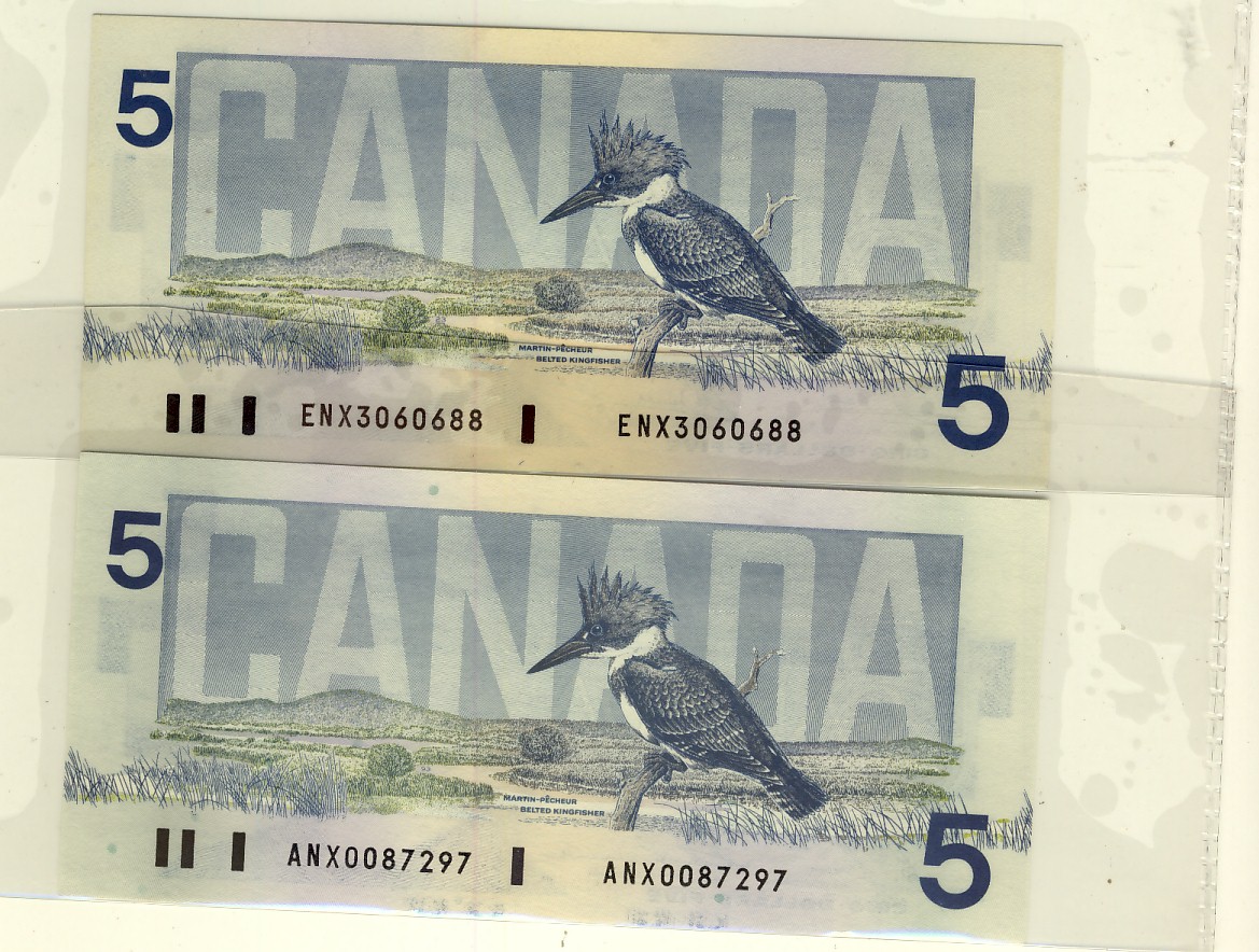 1986 $5 BC-56aA-i #ANX0087297 & 30606688. Lot of 2 notes, both are considered UNC.
