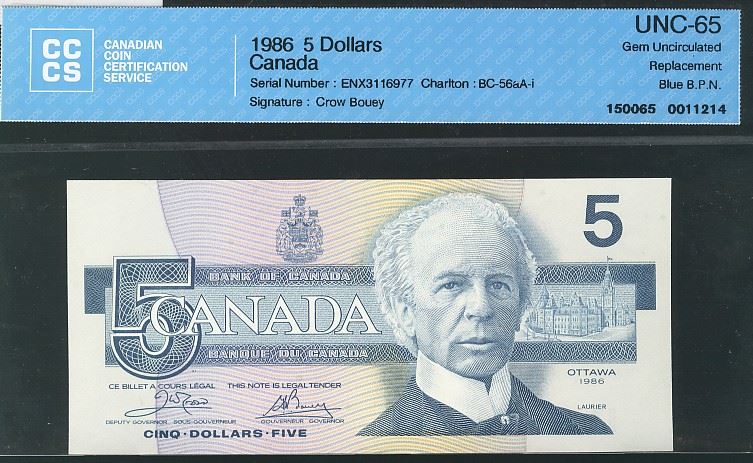 1986 $5 BC-56aA-i #ENX3116977 Blue BPN CCCS Gem UNC65.