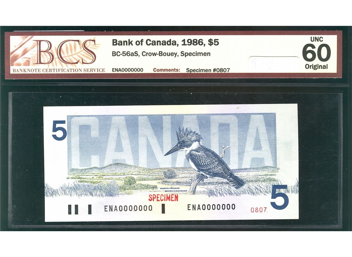 1986 $5 BC-56aS Specimen #0807 BCS UNC60 Original.