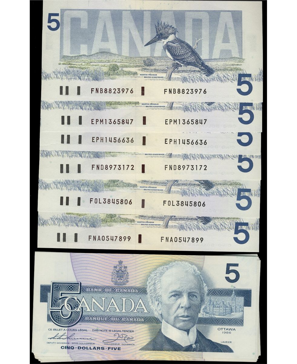 1986 $5 BC-56b. Lot of 35 notes with various prefix letters. EF to UNC with exception of 2 notes VG.