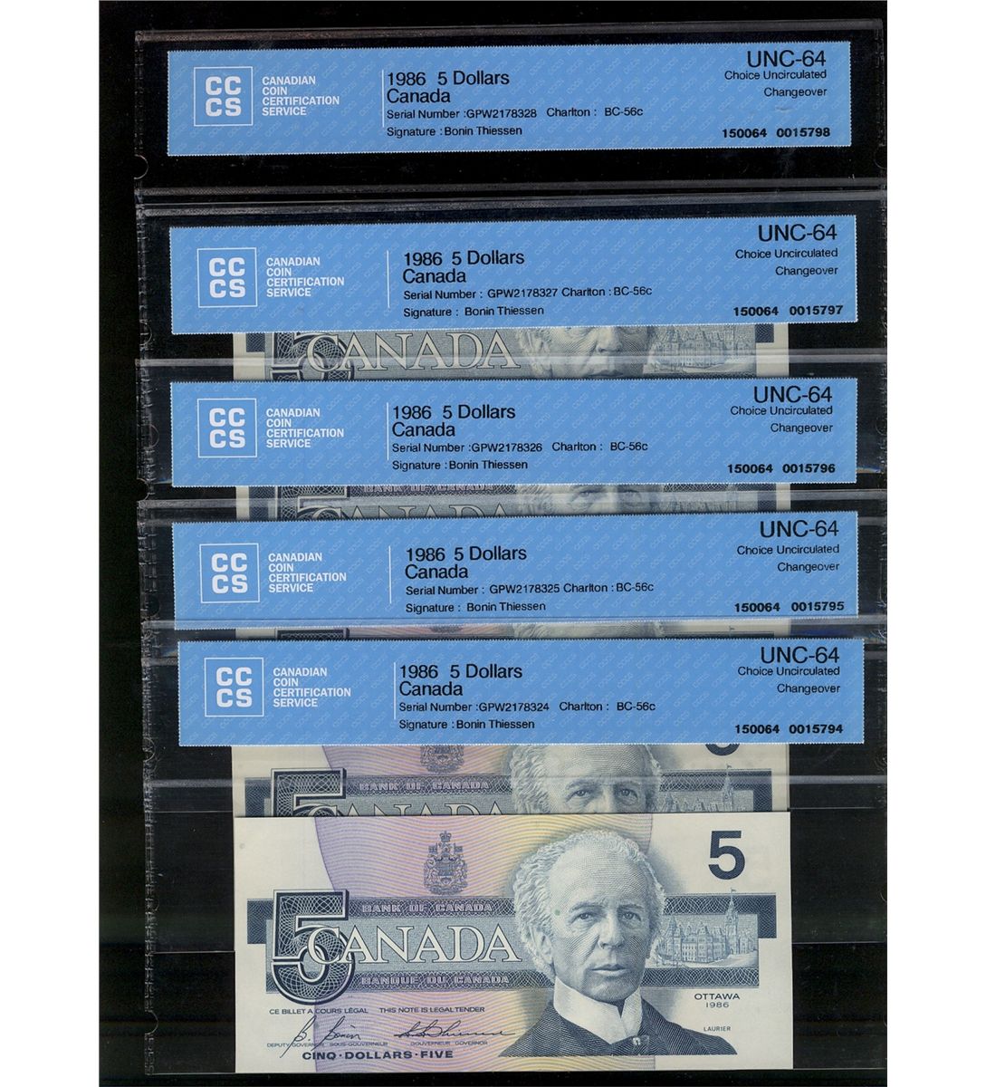 1986 $5 BC-56c Changeover #GPW2178324-328 all CCCS UNC64. Lot of 5 notes.