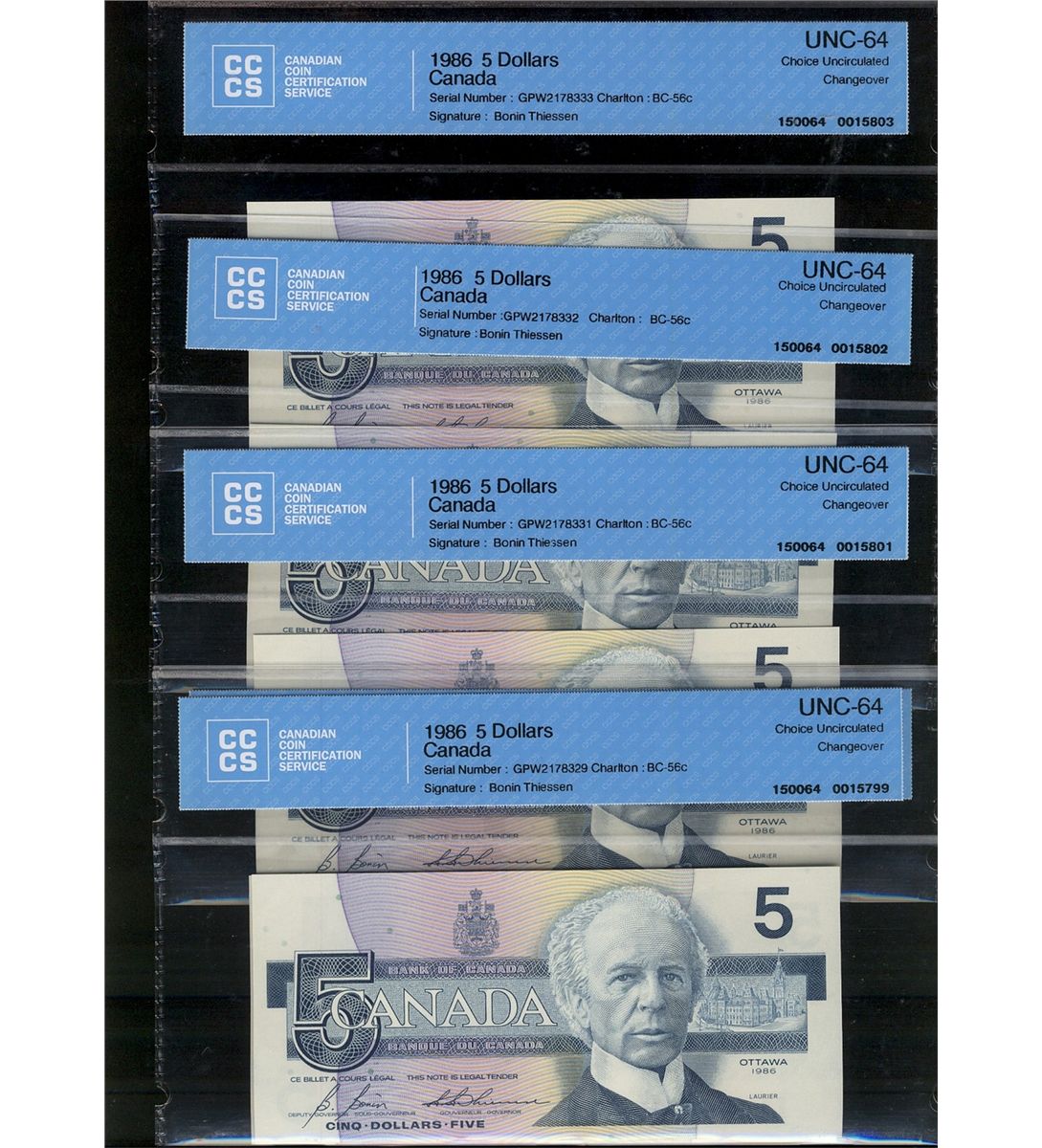 1986 $5 BC-56c Changeover #GPW2178329-333 all CCCS UNC64. Lot of 5 notes.