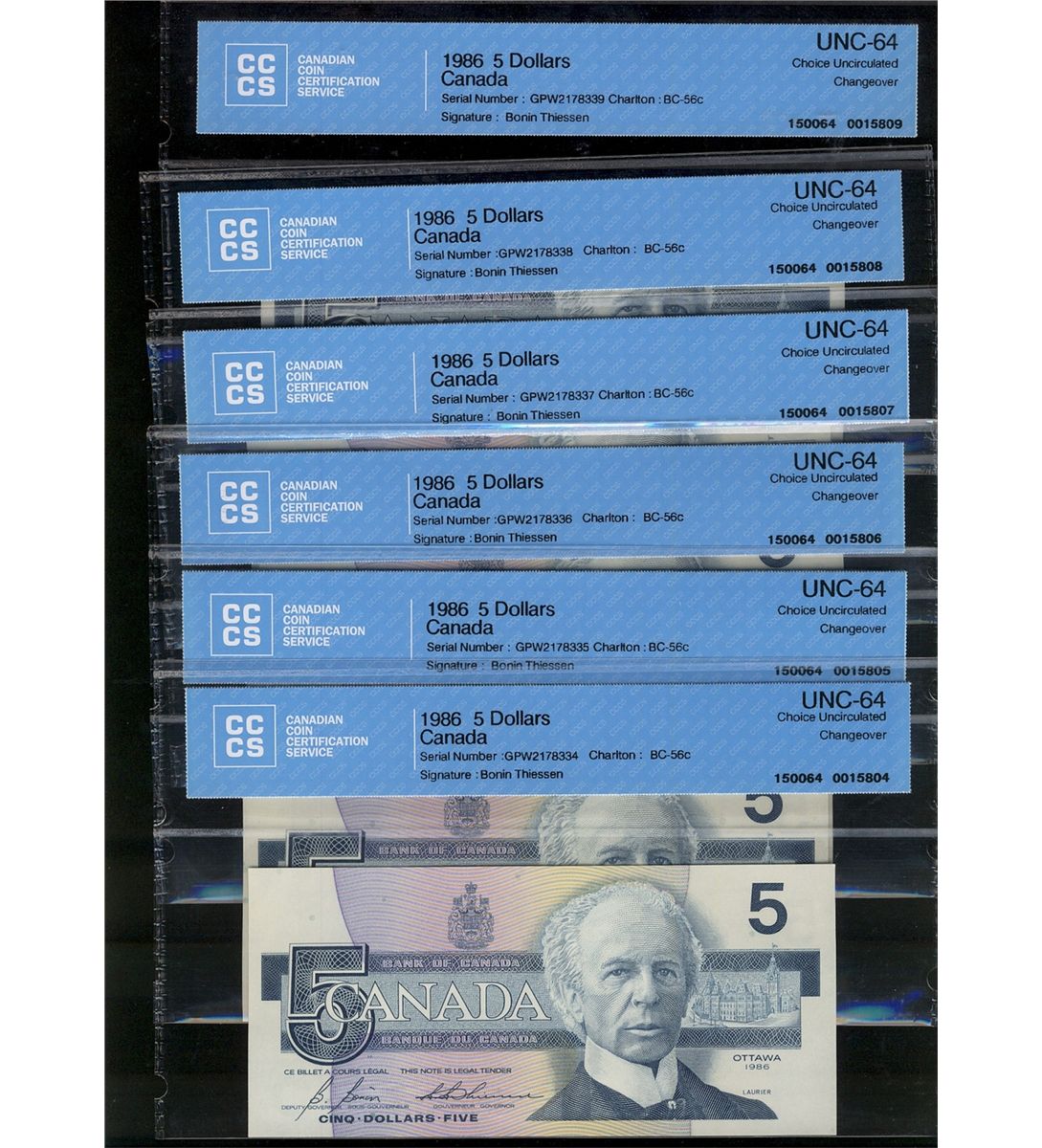 1986 $5 BC-56c Changeover #GPW2178334-339 all CCCS UNC64. Lot of 6 notes.