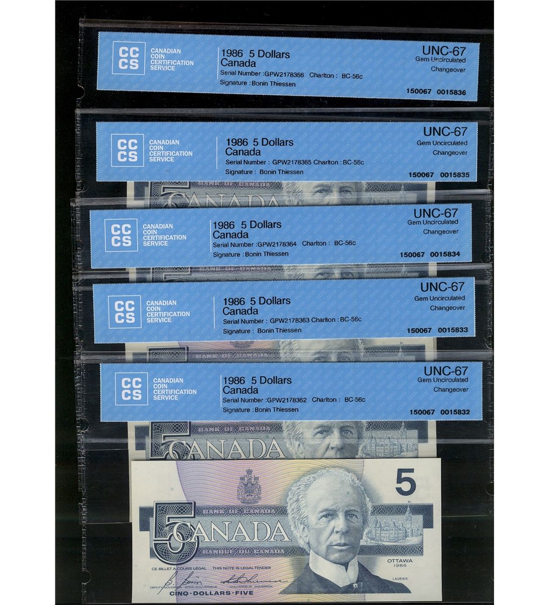 1986 $5 BC-56c Changeover #GPW2178362-366 all CCCS Gem UNC67. Lot of 5 notes