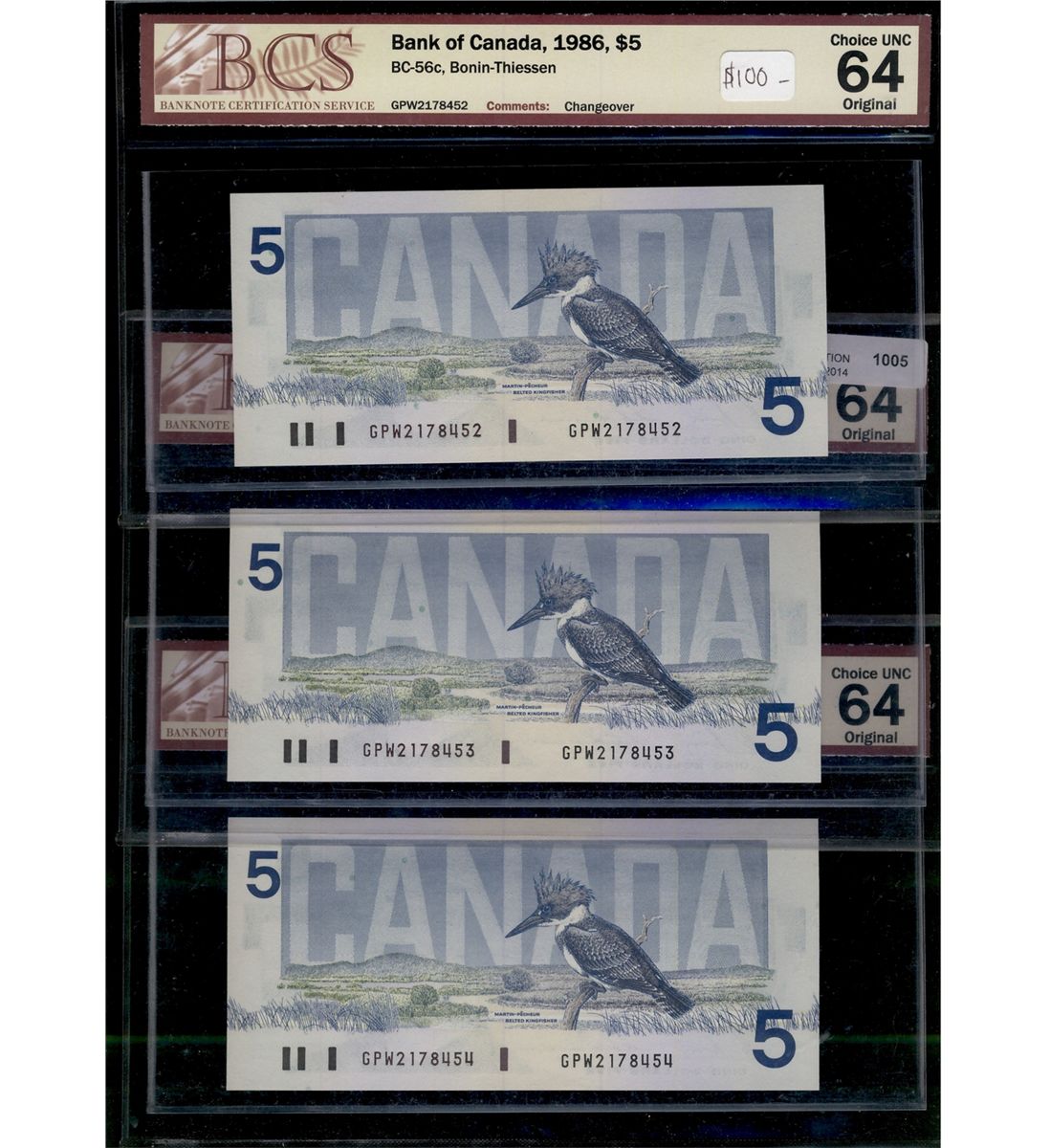 1986 $5 BC-56c #GPW2178453/452 & 454. Lot of 3 notes BCS graded CH UNC64 original.