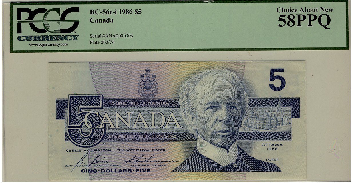 1986 $5 BC-56c-i ANA0000003 PCGS AU58PPQ