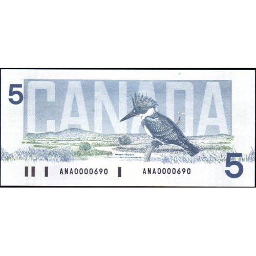 1986 Five Dollars Bonin-Thiessen, BC-56c-i, Serial Number ANA0000690, Gem Uncirculated