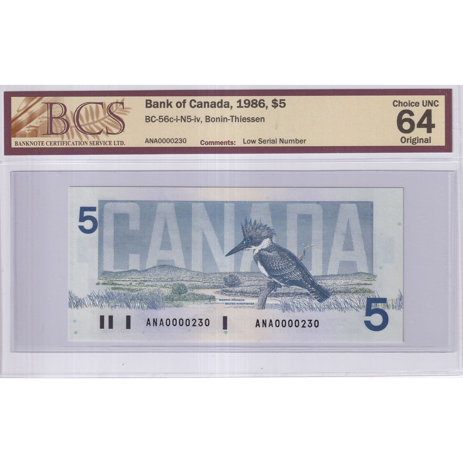 1986 $5 BC-56c-i-N5-iv, Bank of Canada, Bonin-Thiessen, Low Serial Number ANA0000230, BCS Certified