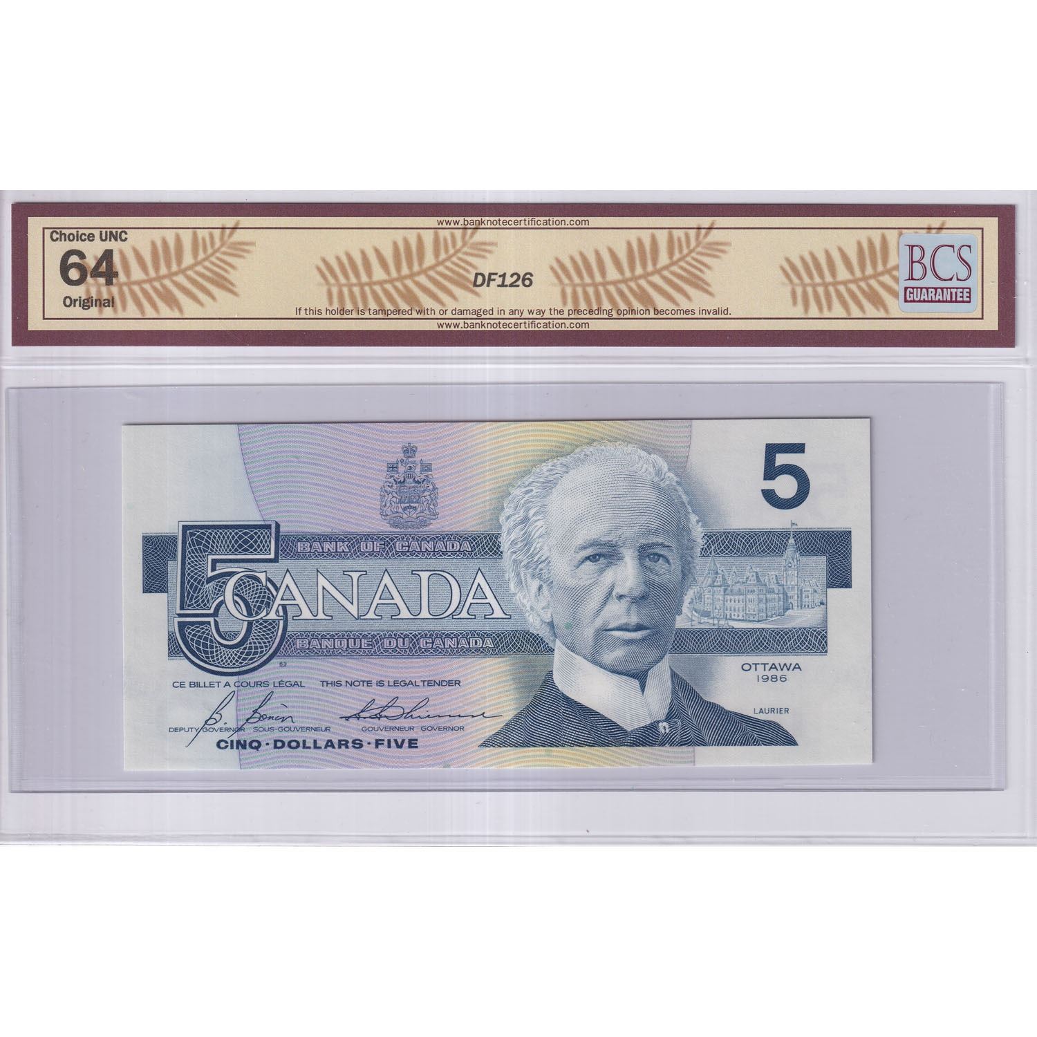 1986 $5 BC-56c-i-N5-iv, Bank of Canada, Bonin-Thiessen, Low Serial Number ANA0000230, BCS Certified CUNC-64 Original.