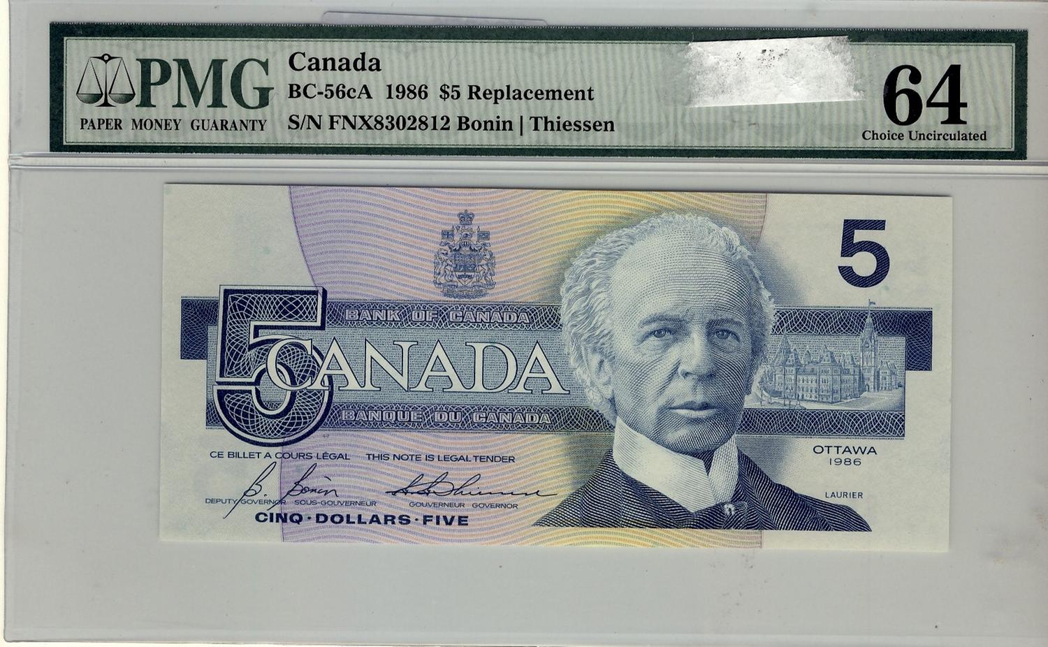 1986 $5 BC-56cA #FNX8302812 PMG UNC64 Bonin-Thiessen