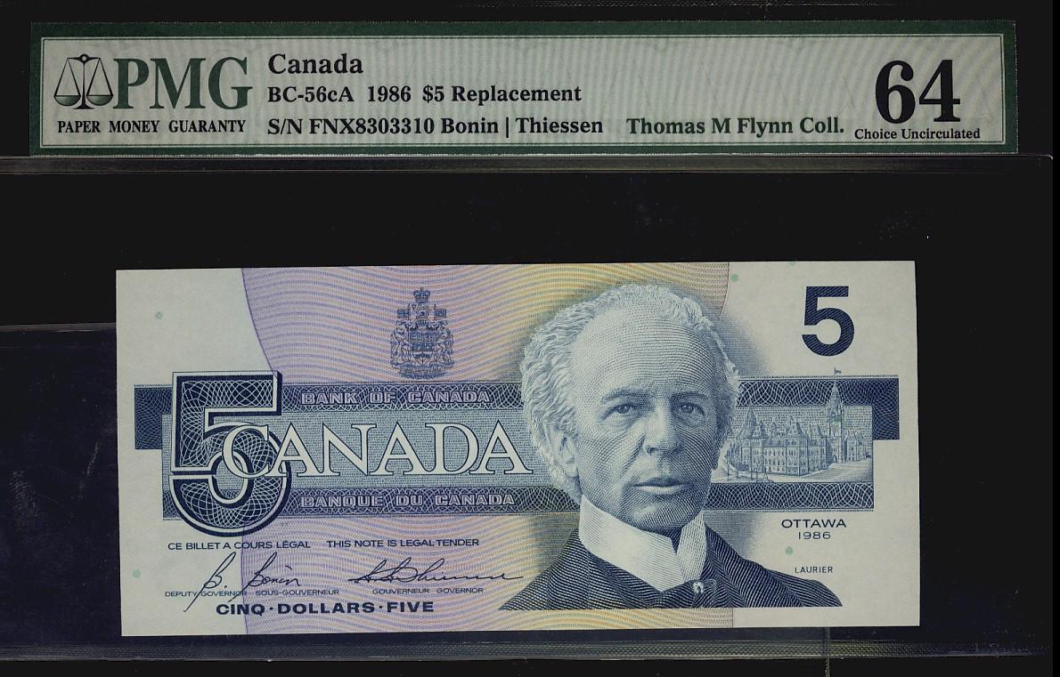 1986 $5 BC-56cA #FNX8303310 PMG CH UNC64. From the Thomas Flynn collection.