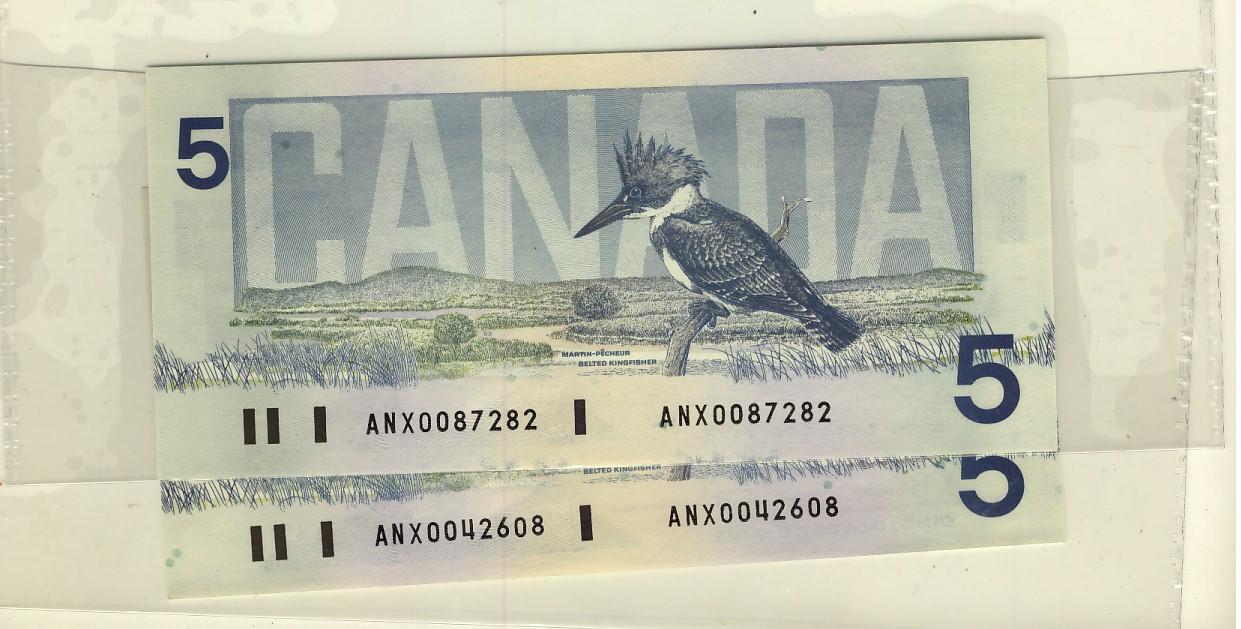 1986 $5 BC-56cA-i #ANX0087282/0042608. Lot of 2 UNC notes.