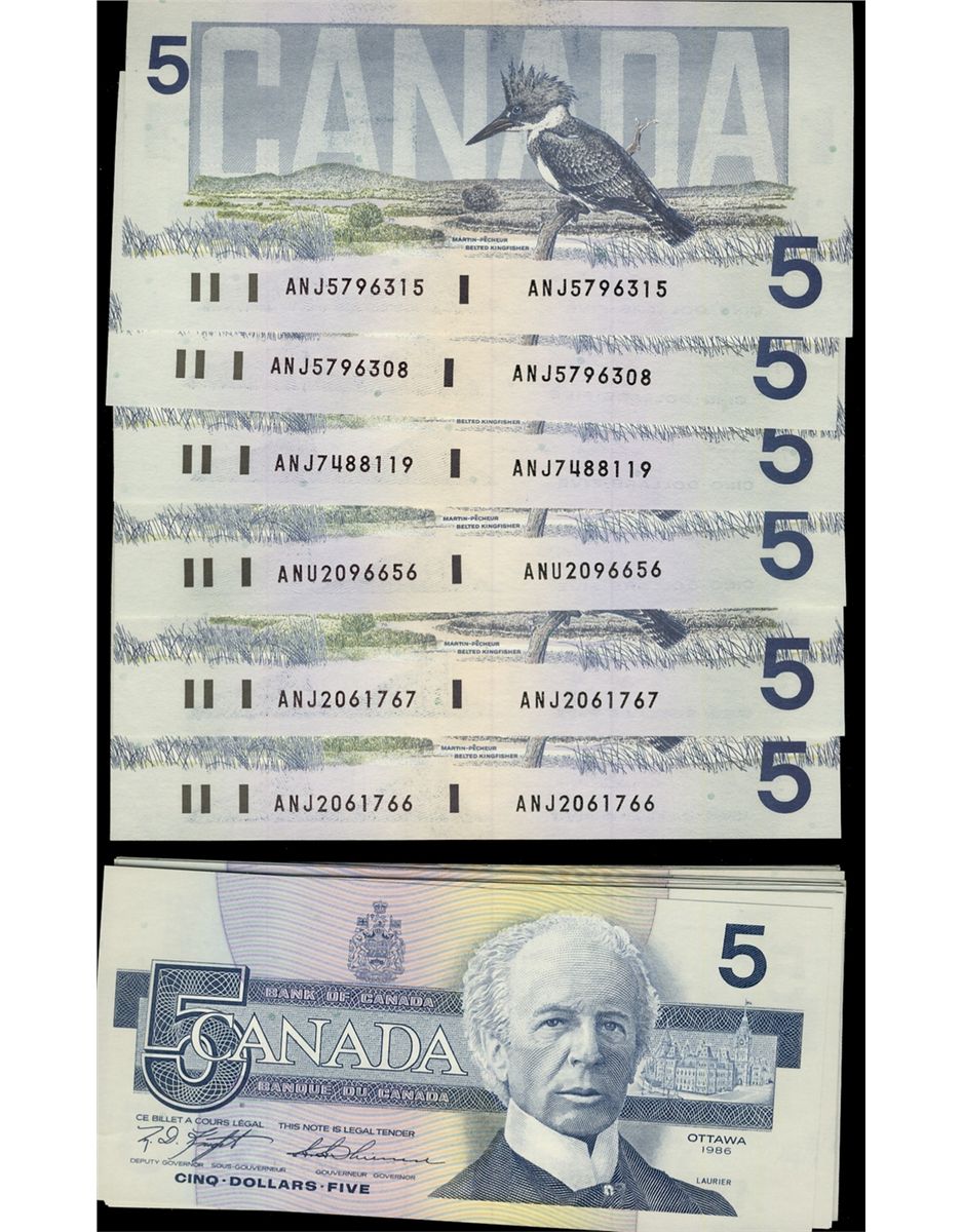 1986 $5 BC-56e. Lot of 37 notes with various prefix letters. EF to UNC with exception of approx 7 notes VG to VF.