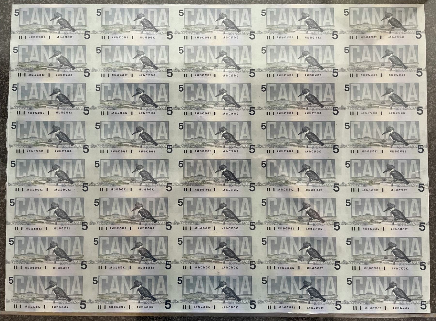1986 $5 BC-56e-i #ANU Uncut Sheet of 40 notes. A nice typical AU/UNC example with light handling and some remnance paper on rims (minor tear).