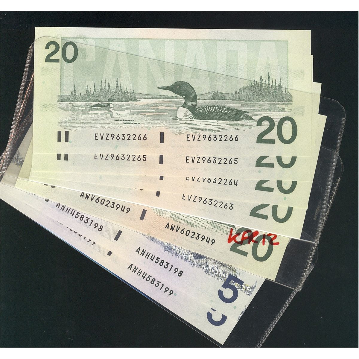 1986 $5 BC56d(2), 1991 $20 BC-58dA-i #AWV6023949 & BC-56d(4). Lot of 7 notes all Crisp UNC. (Face $110)
