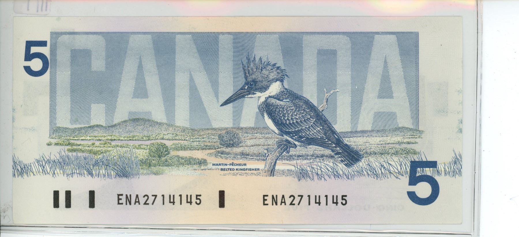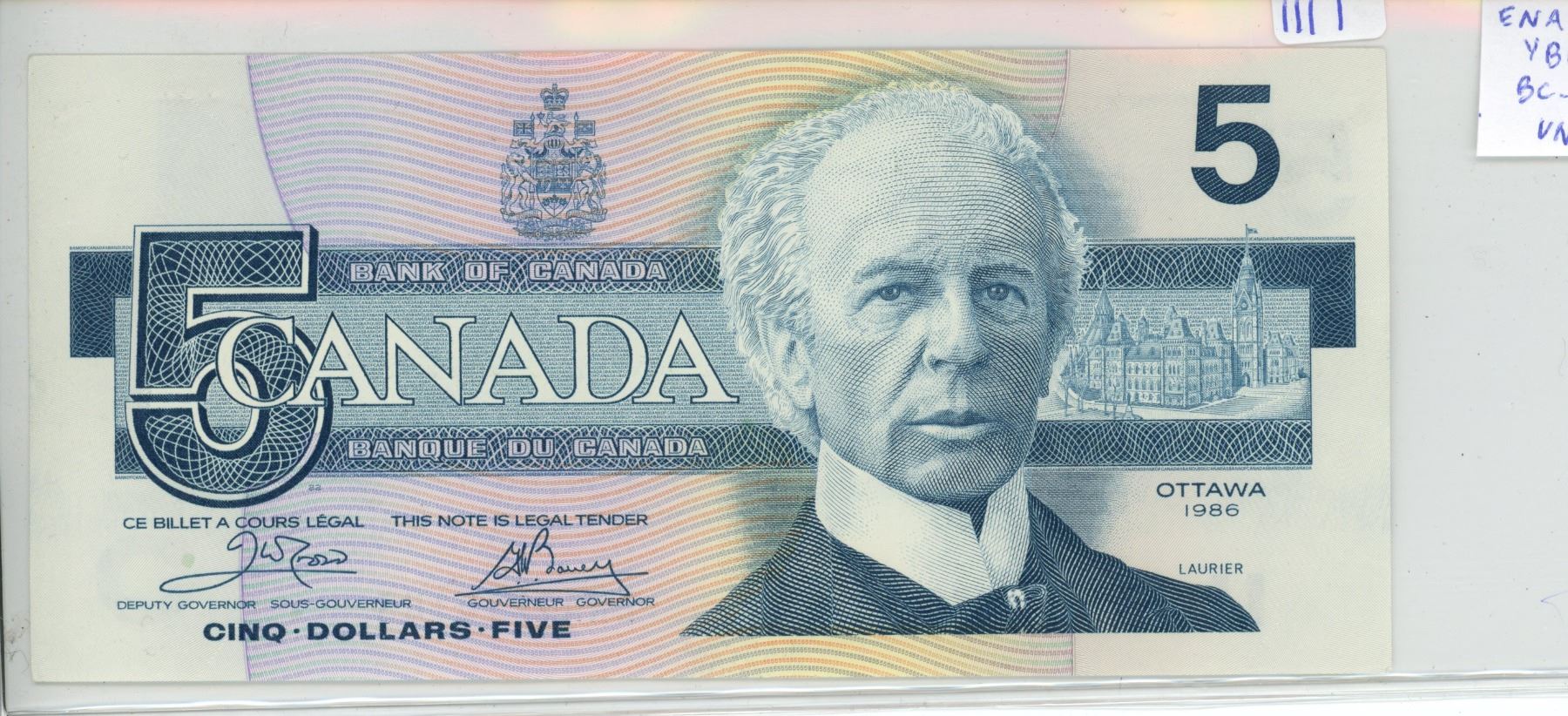 1986 $5. Crow-Bouey signatures. ENA Prefix. Yellow Back Position Number. BC-56a. Uncirculated.