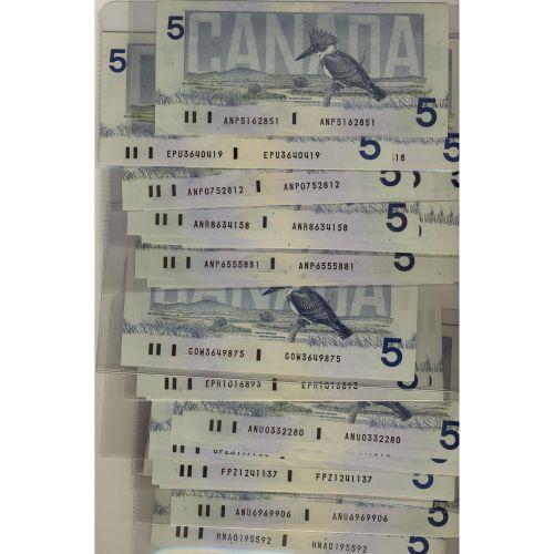 1986 $5. Lot of 78 notes including different prefixes and diefferent signatures. UNC. Should be viewed