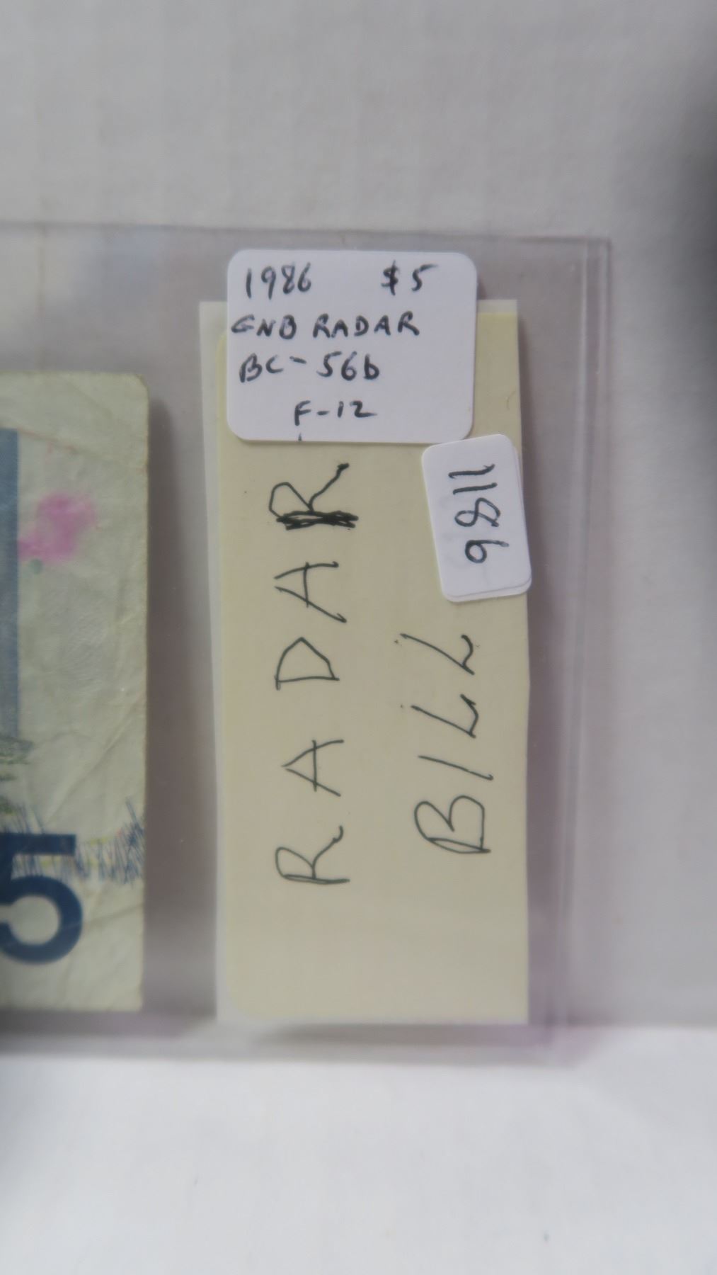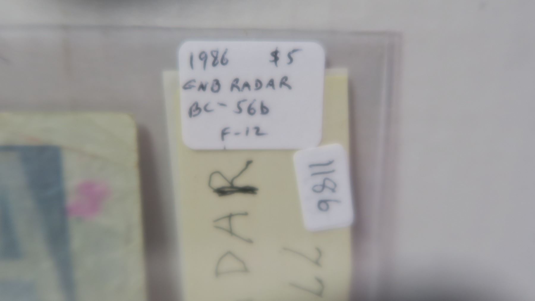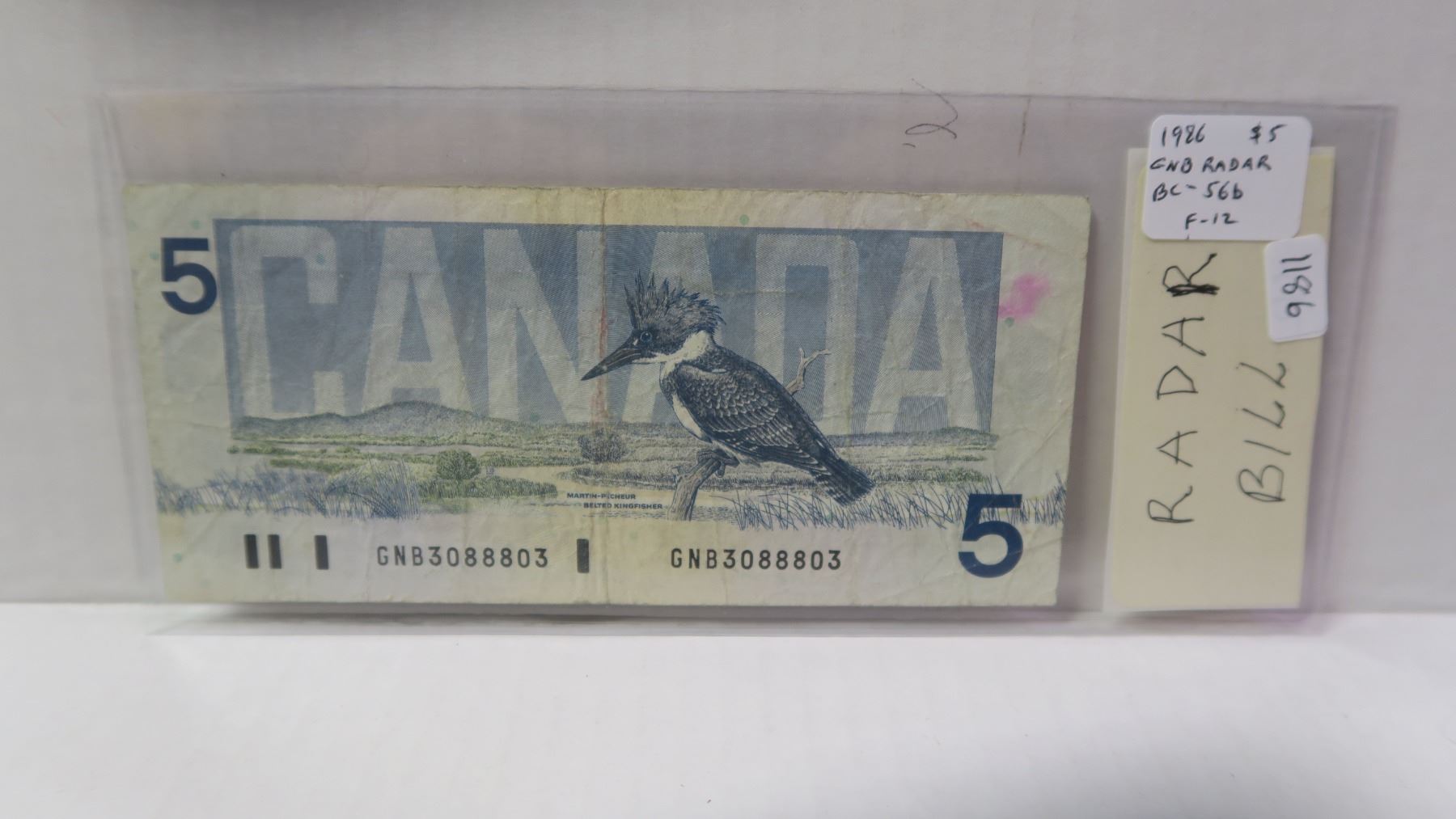 1986 $5 RADAR. Thiessen-Crow signatures. GNB Prefix. Serial Number 3088803. BC-56b. F-12.