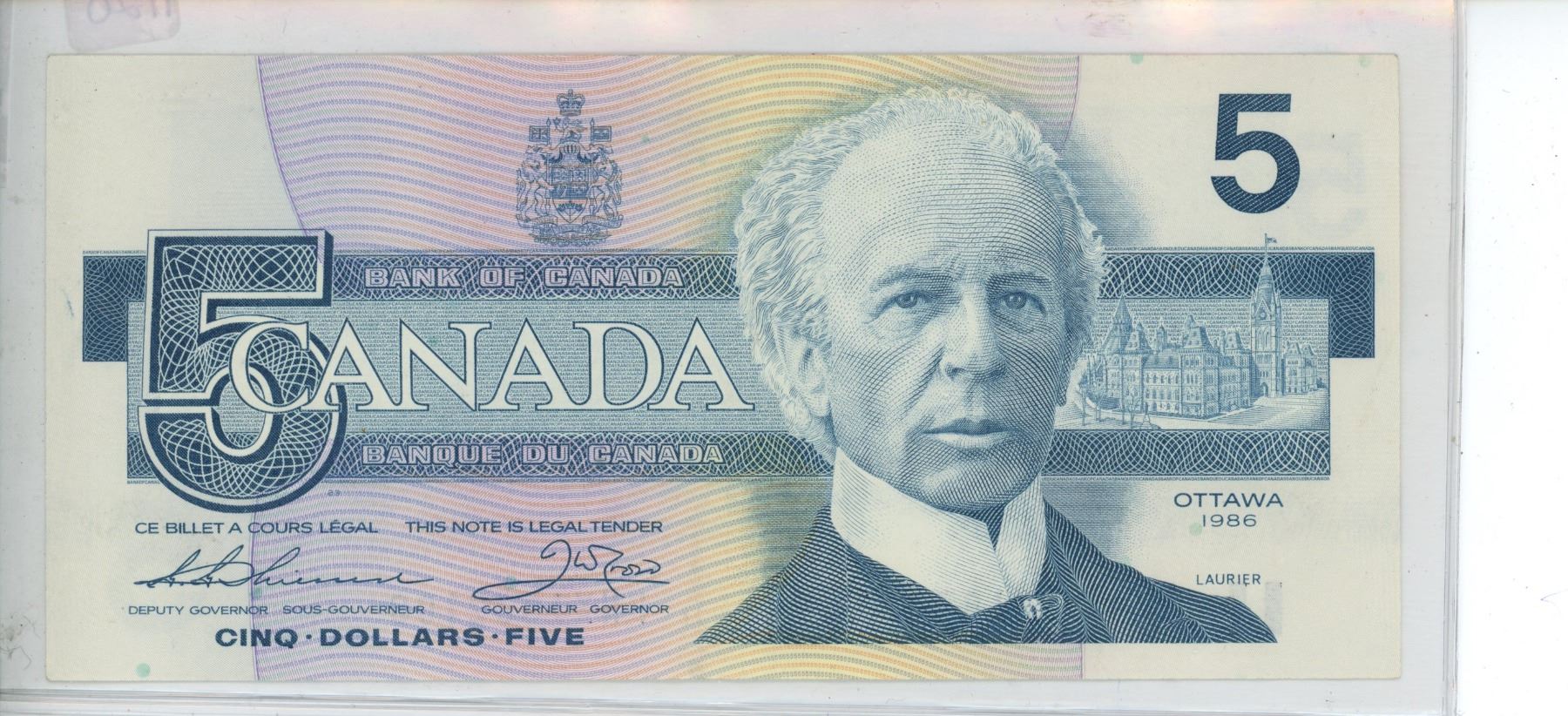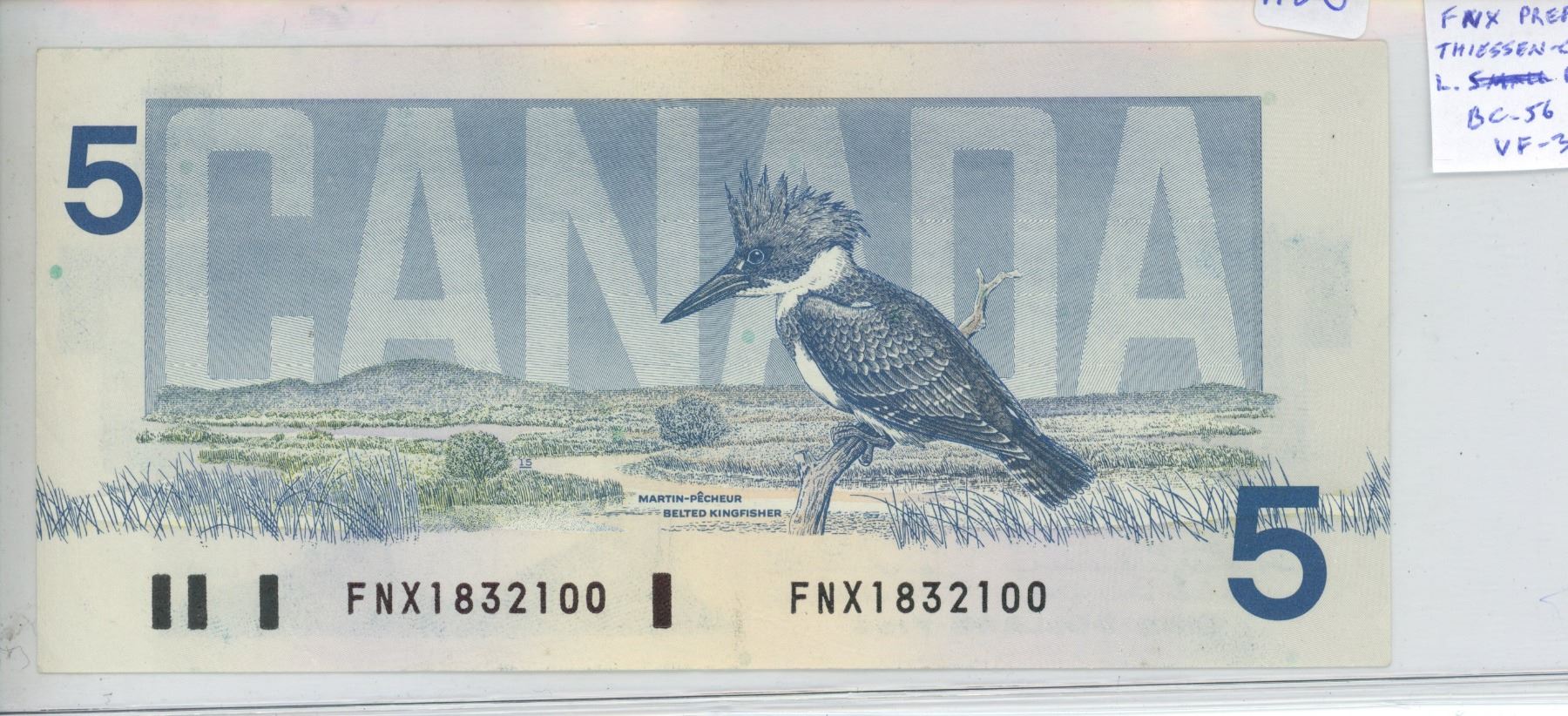 1986 $5 Replacement. Thiessen-Crow signatures. FNX Replacement Prefix. BC-56. VF-30.