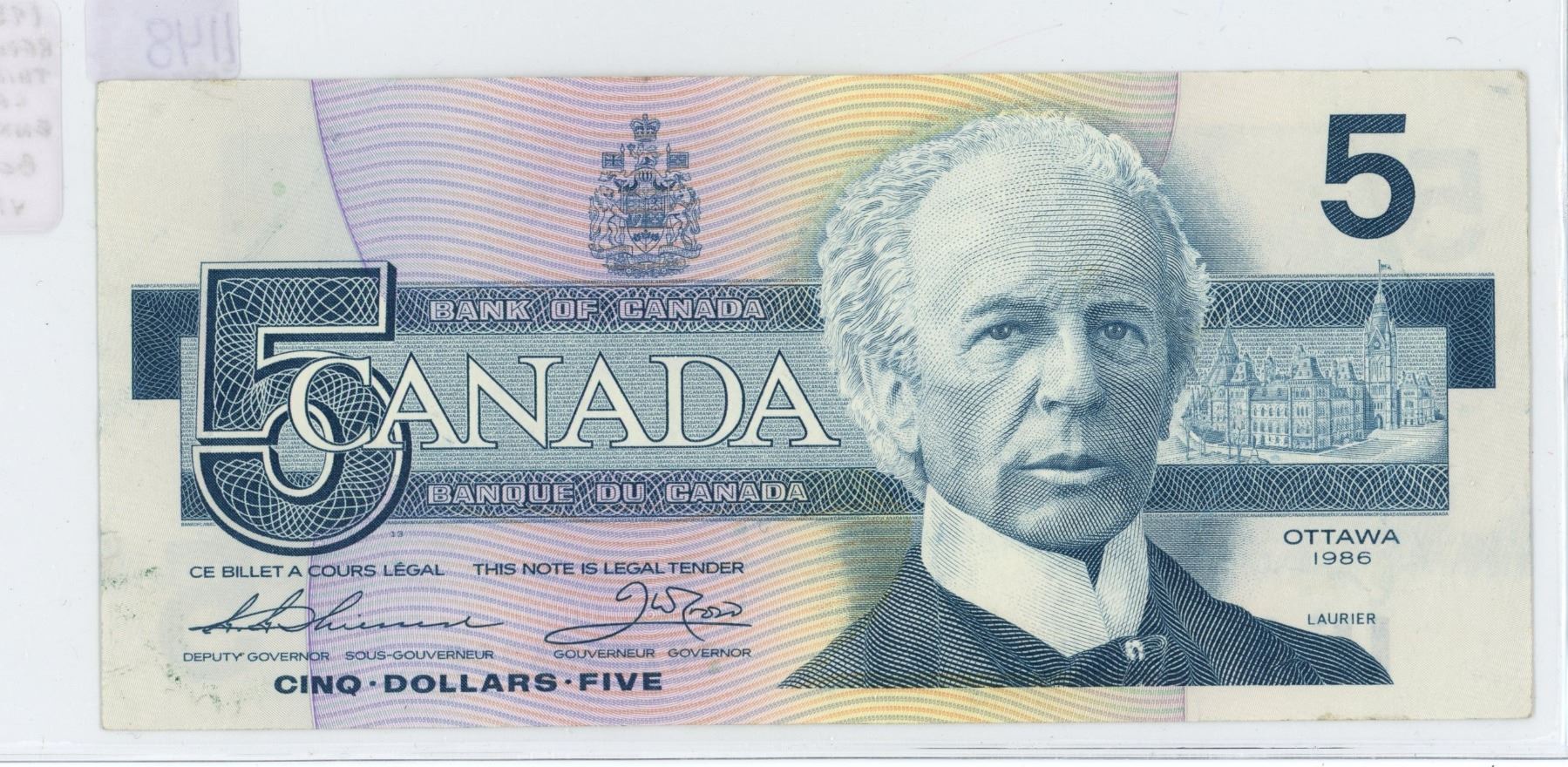 1986 $5 Replacement note. Thiessen-Crow signatures. ENX Replacement Prefix. BC-56b. VF-30.