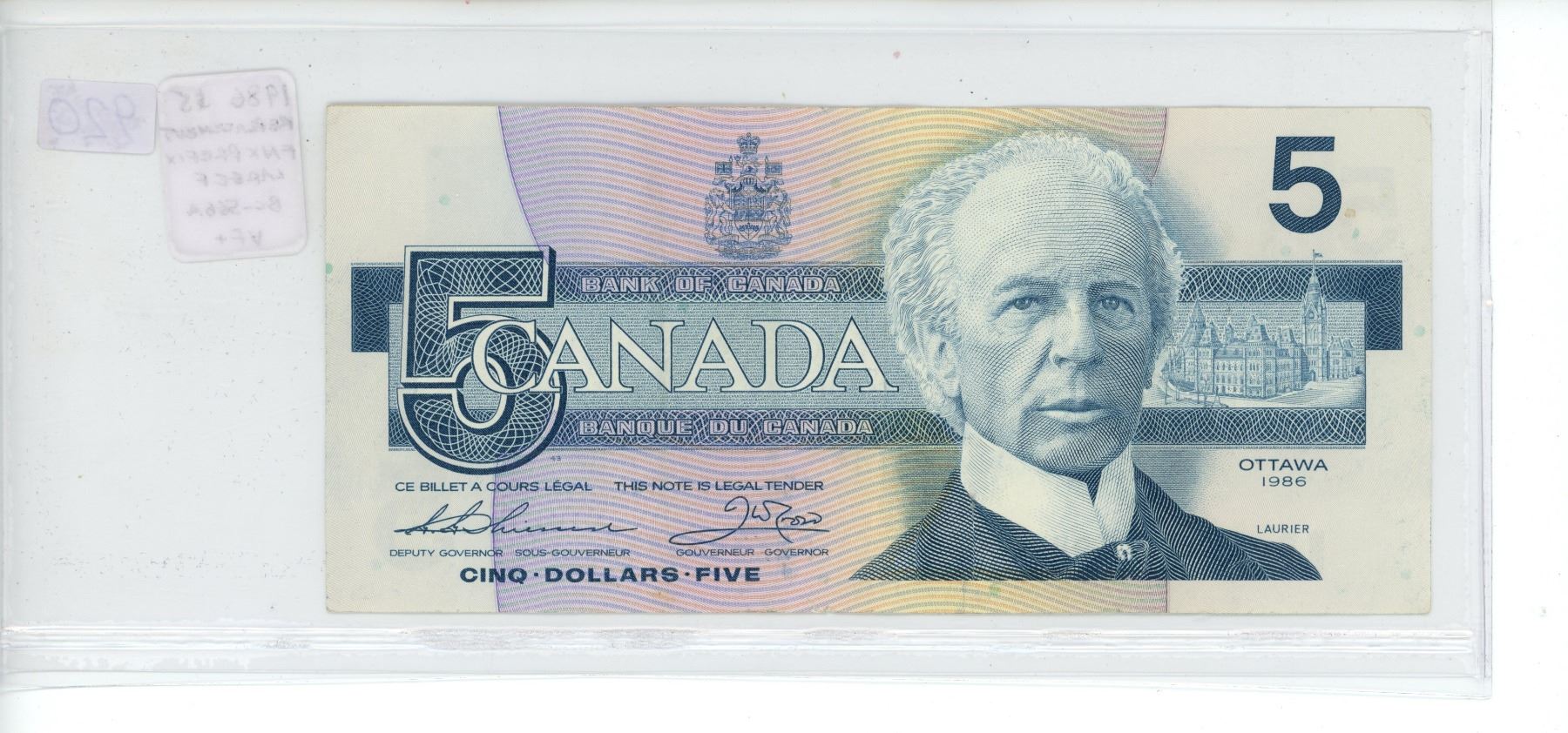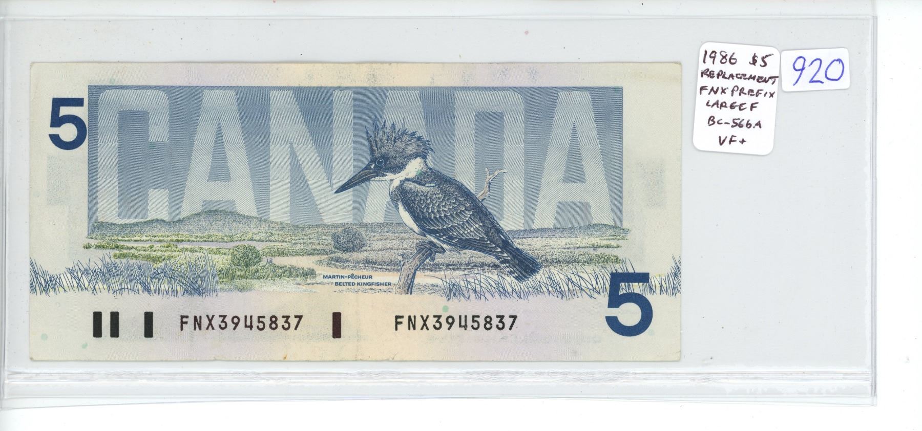 1986 $5 Replacement note. Thiessen-Crow signatures. FNX Replacement Prefix. Large F. BC-46bA. VF-30.