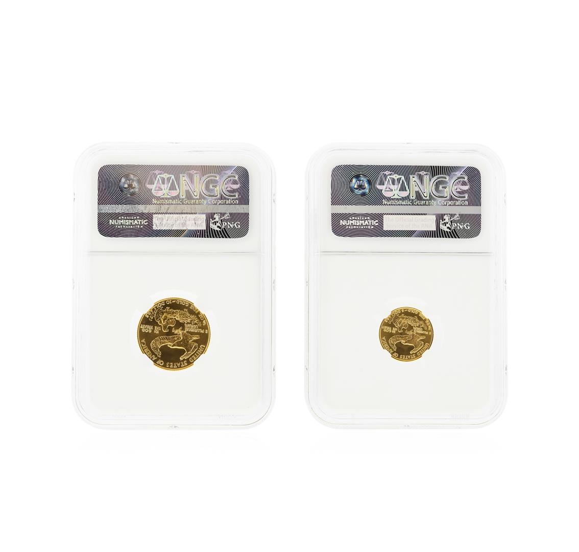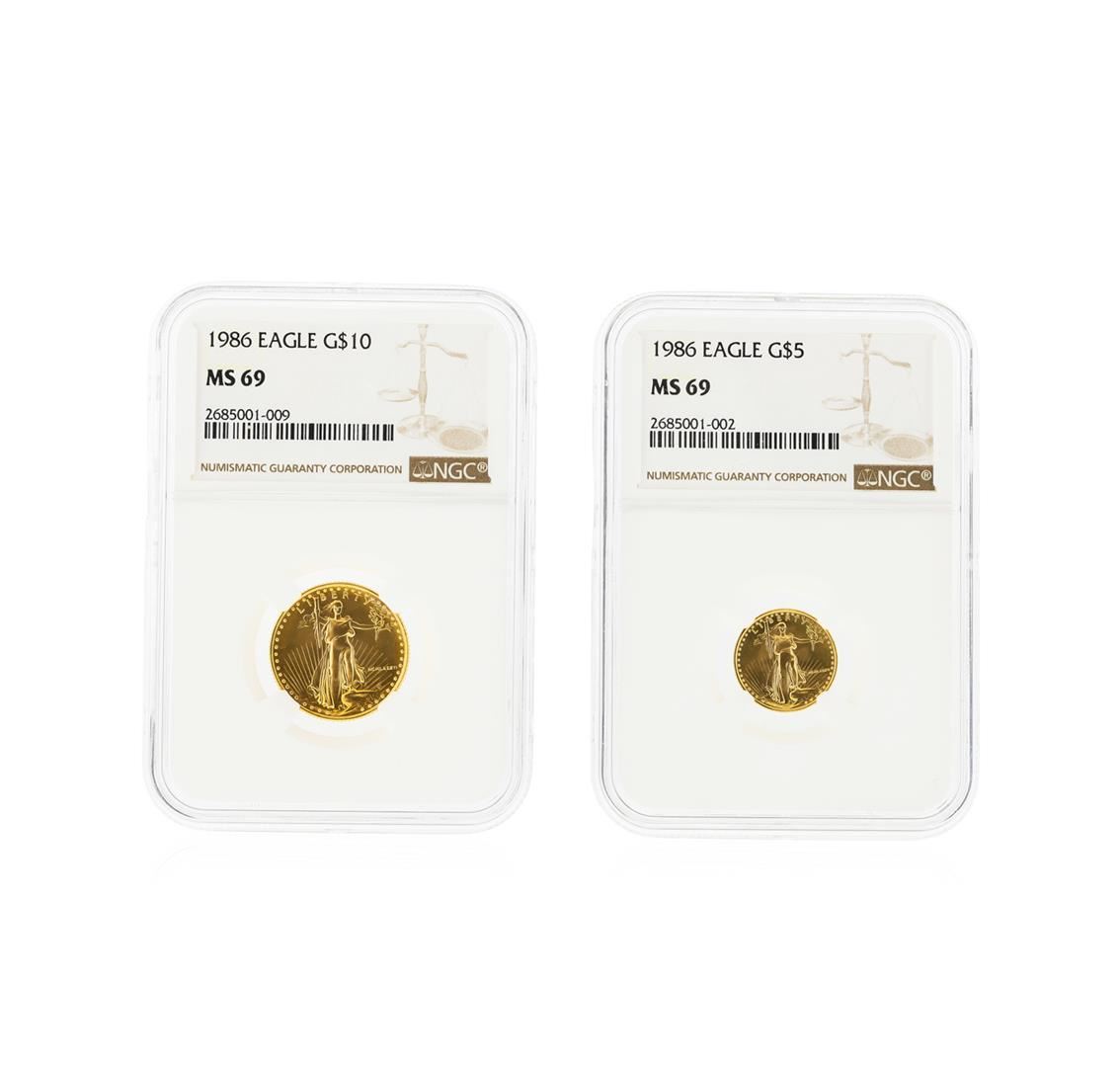 One 1986 $5 and $10 American Gold Eagle Coin Set NGC Graded MS69. NGC Certified.