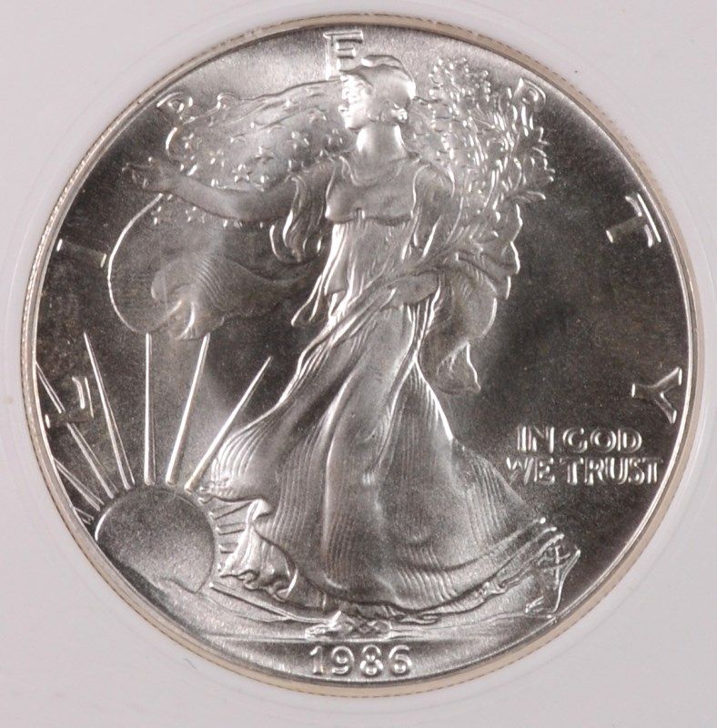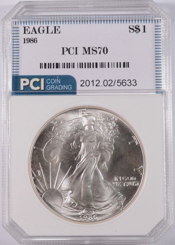 1986 AMERICAN SILVER EAGLE, PCI MS-70 RARE TRENDS PRICE $450.00